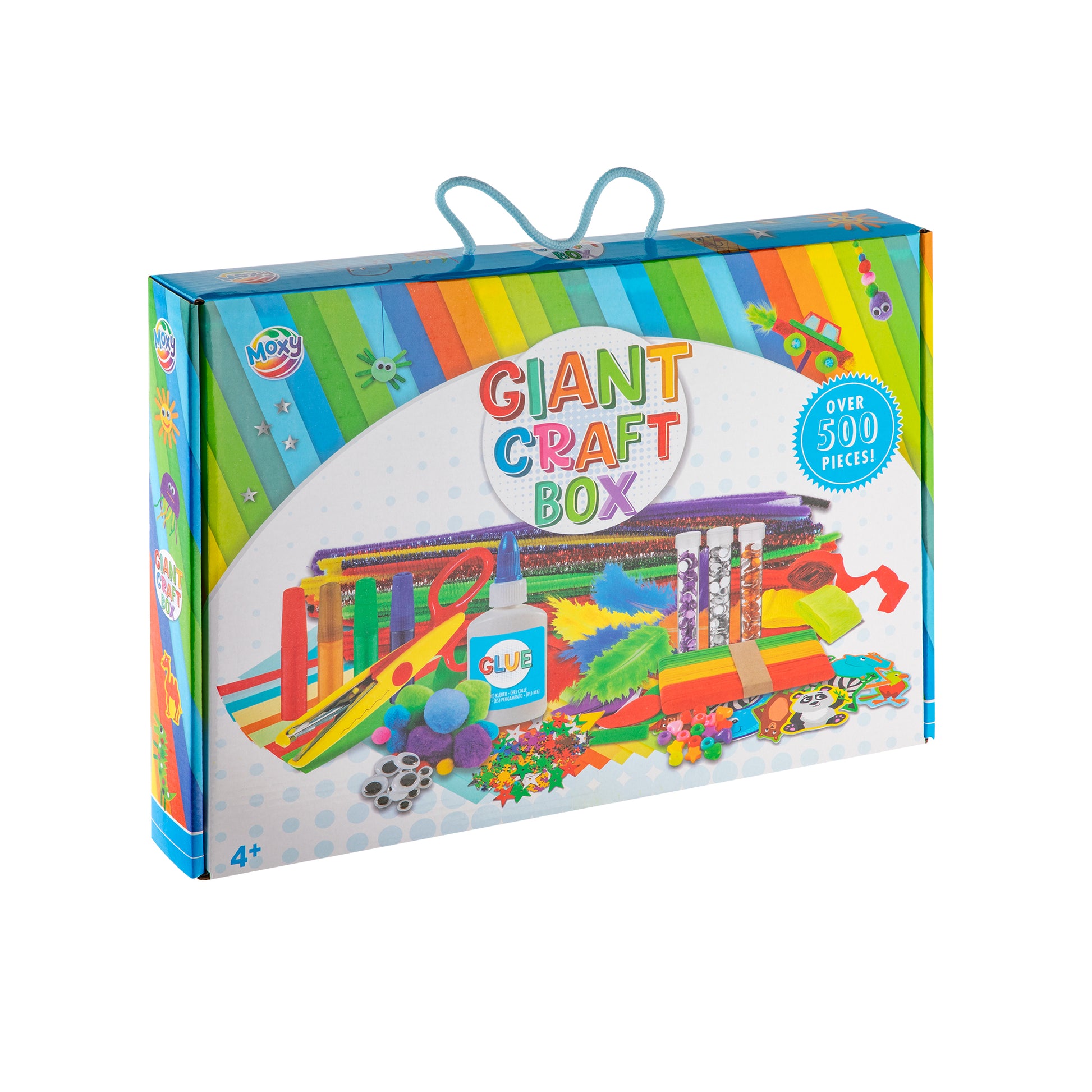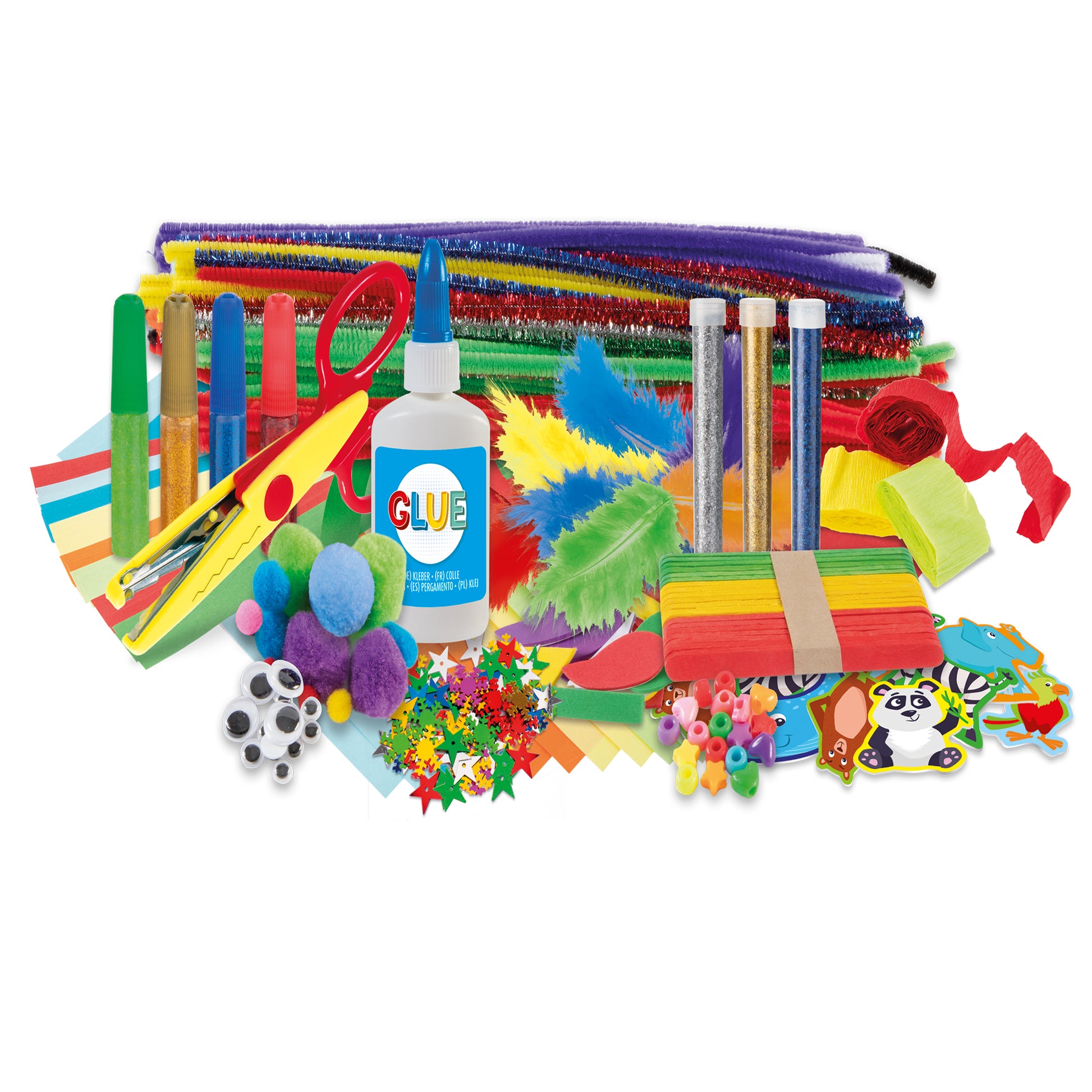 Contenido: alambre de chenilla, figuras de espuma, palitos de helado, tiras de papel, papel, plumas, tijeras, pompones, pegamento con brillantina, pegamento, brillantina, pegatinas, lentejuelas de estrellas, cuentas, papel crepé y más.