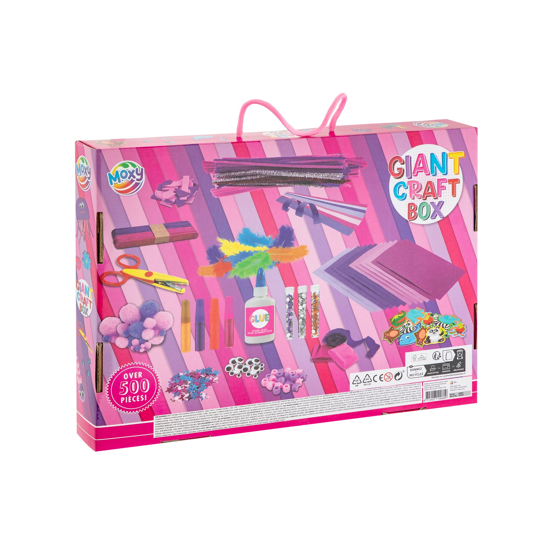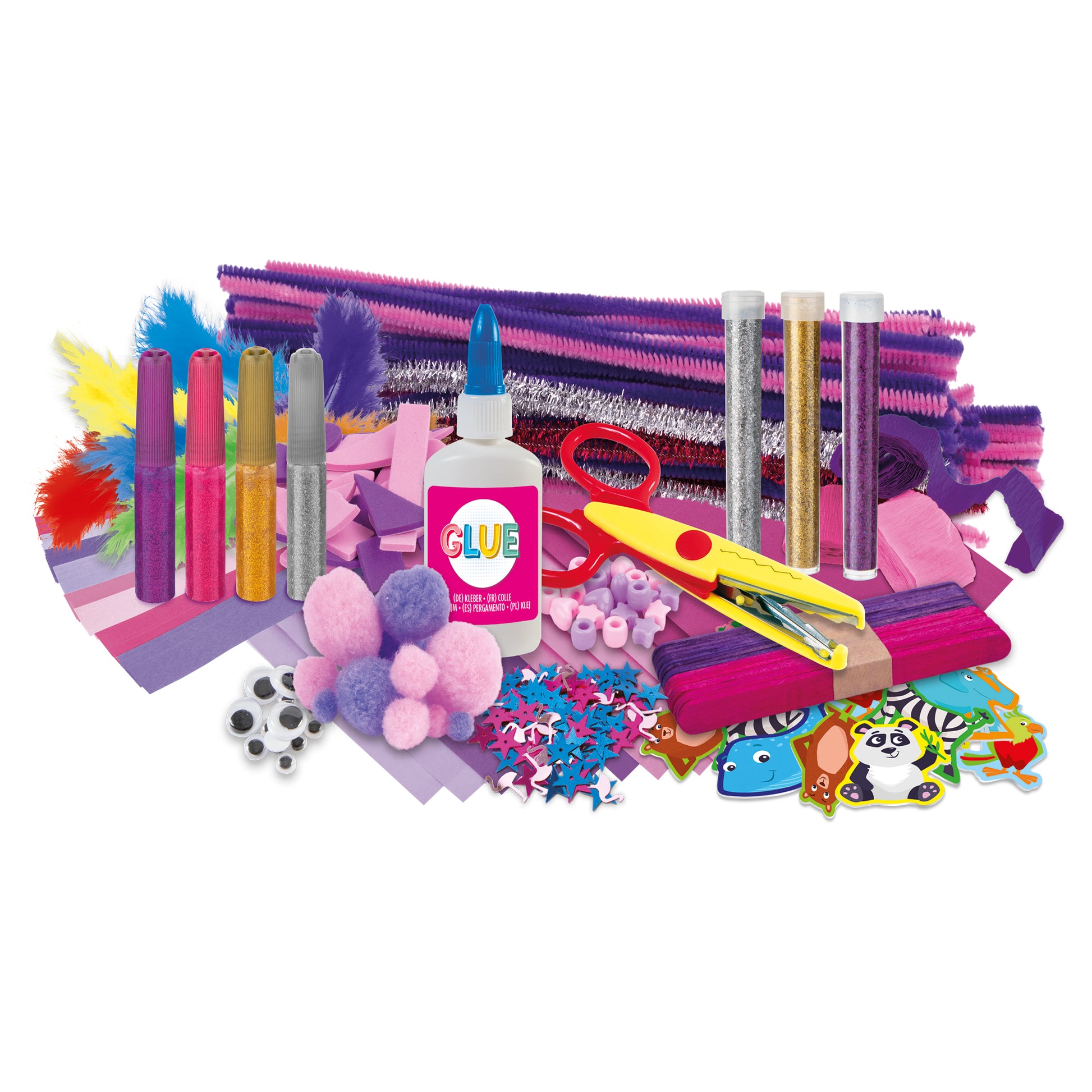 Contenido: alambre de chenilla, figuras de espuma, palitos de helado, tiras de papel, papel, plumas, tijeras, pompones, pegamento con brillantina, pegamento, brillantina, pegatinas, lentejuelas de estrellas, cuentas, papel crepé y más.