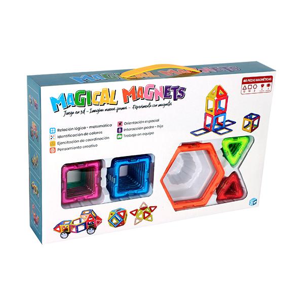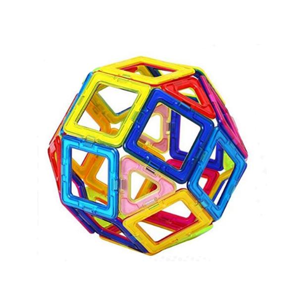 Conjunto de piezas magnéticas en formas geométricas de cuadrados, triángulos y hexágonos con accesorios para construir figuras de plano a 3D.