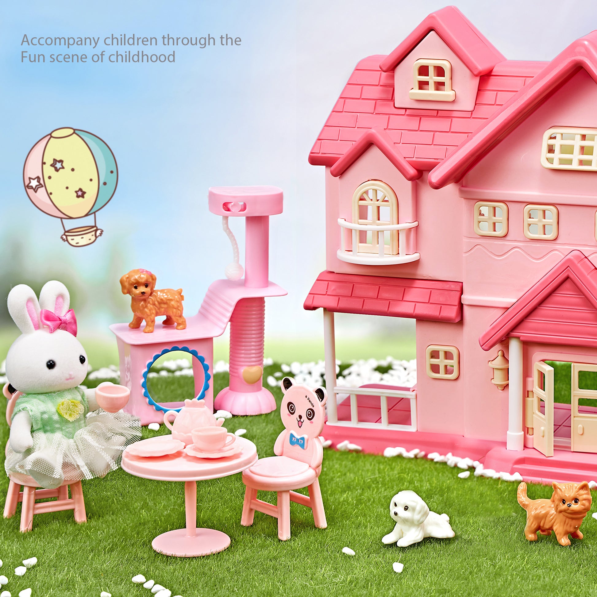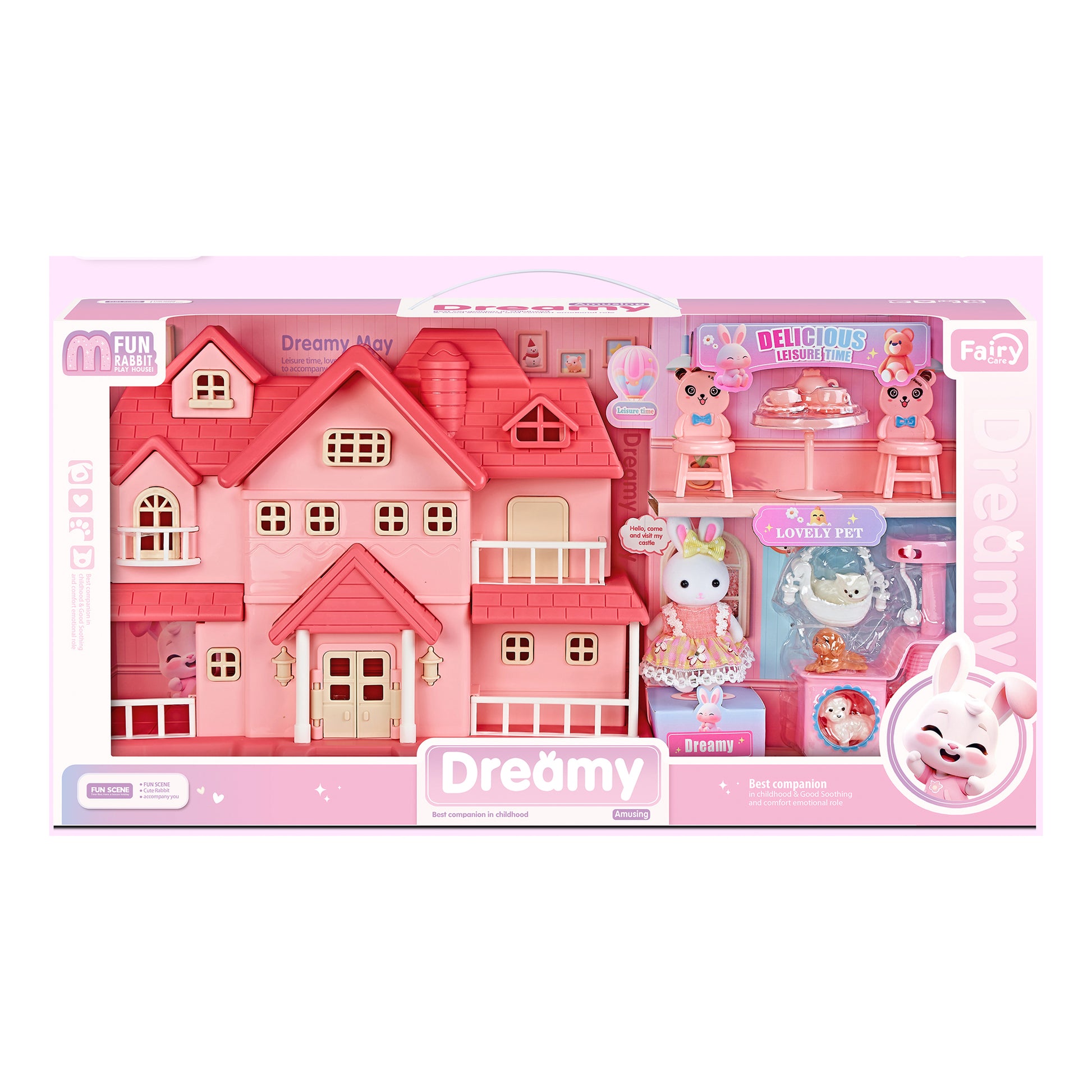 Un divertido juego de cocina de ensueño con adorables conejitos de peluche. Incluye una cocina en miniatura detallada con estufa, armarios, mesa de comedor y diversos accesorios con temática de comida, además de encantadores conejitos de peluche con preciosos atuendos y una pequeña figura de perrito.
