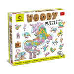 Un puzzle de madera de forma especial en el que está representado un colorido paisaje. Entre las piezas que componen el puzle hay 12 animales perfilados que también se pueden colocar de pie sobre sus bases. El juego estimula la lógica, las habilidades visoespaciales y la motricidad fina.