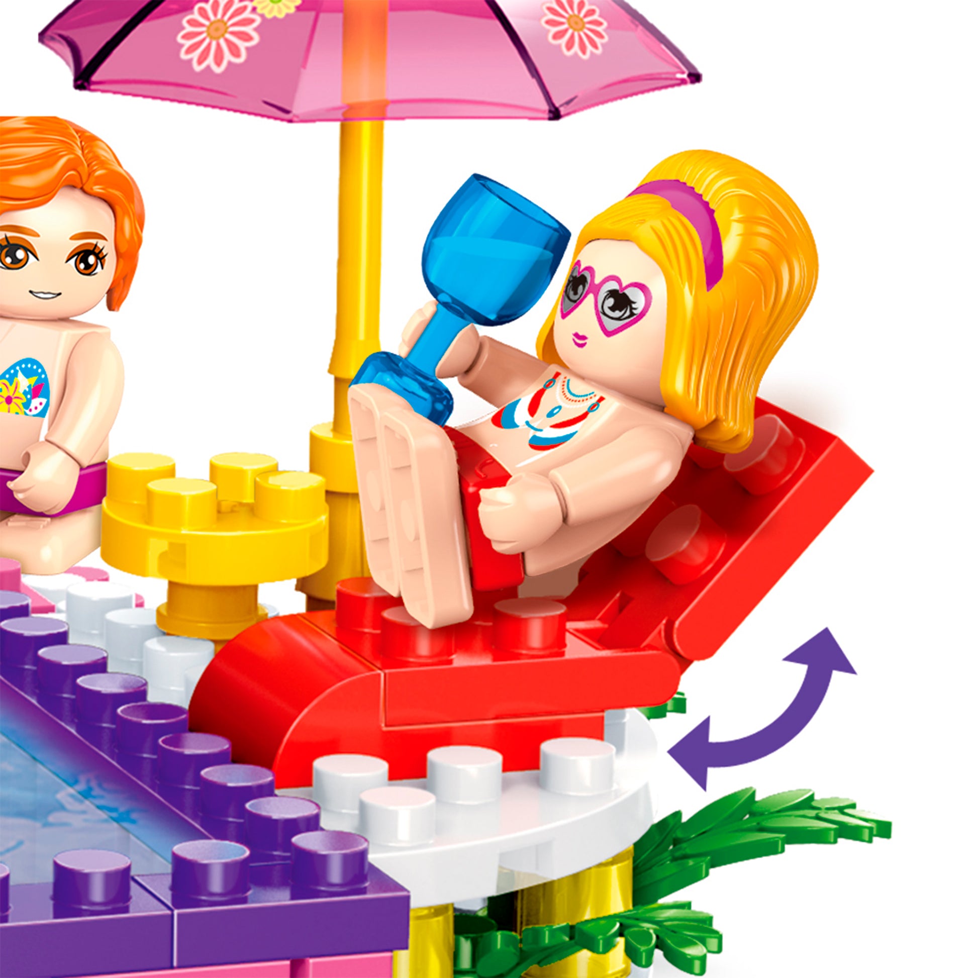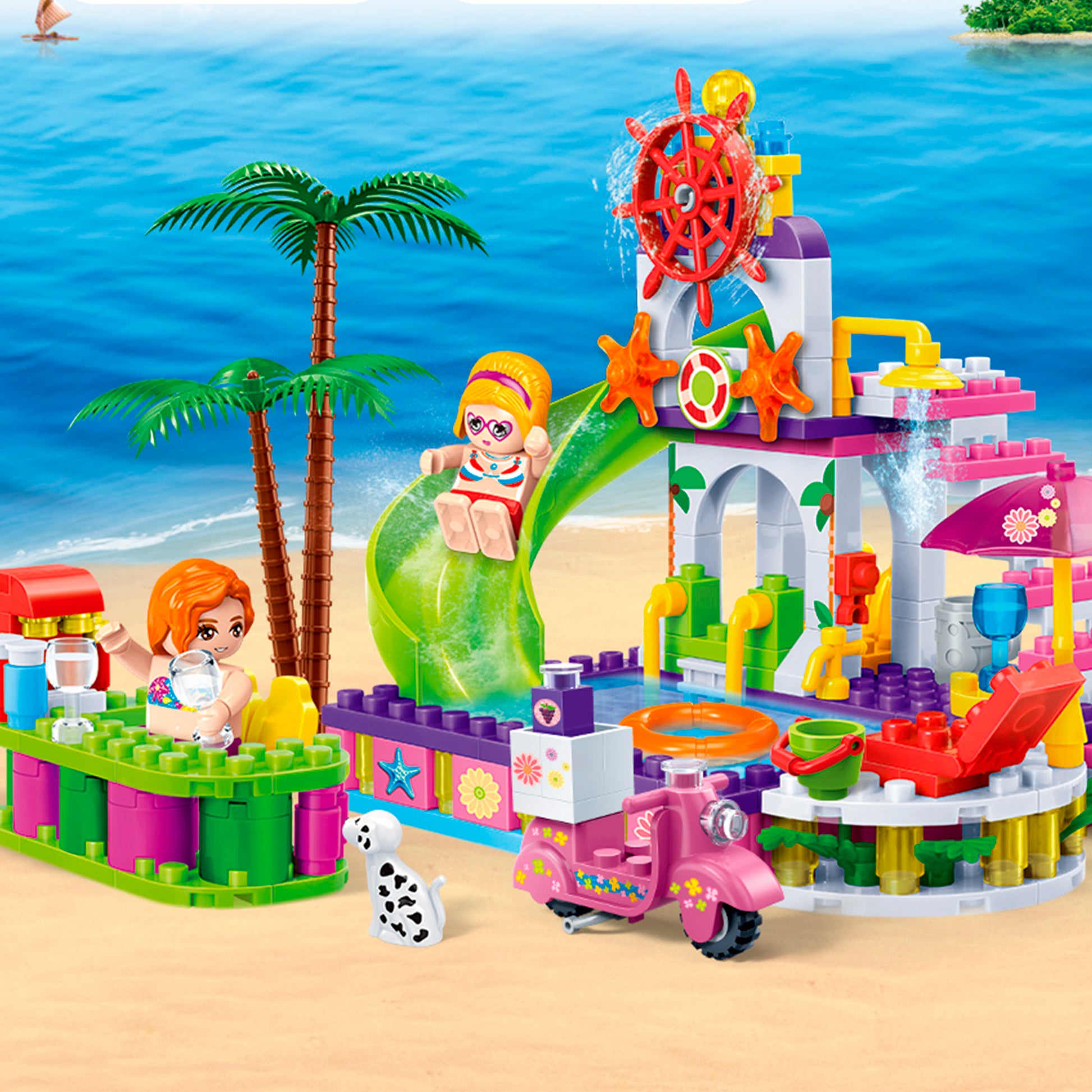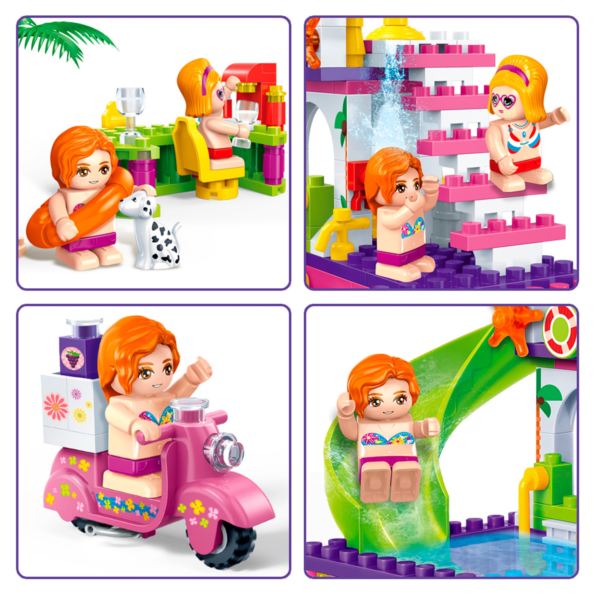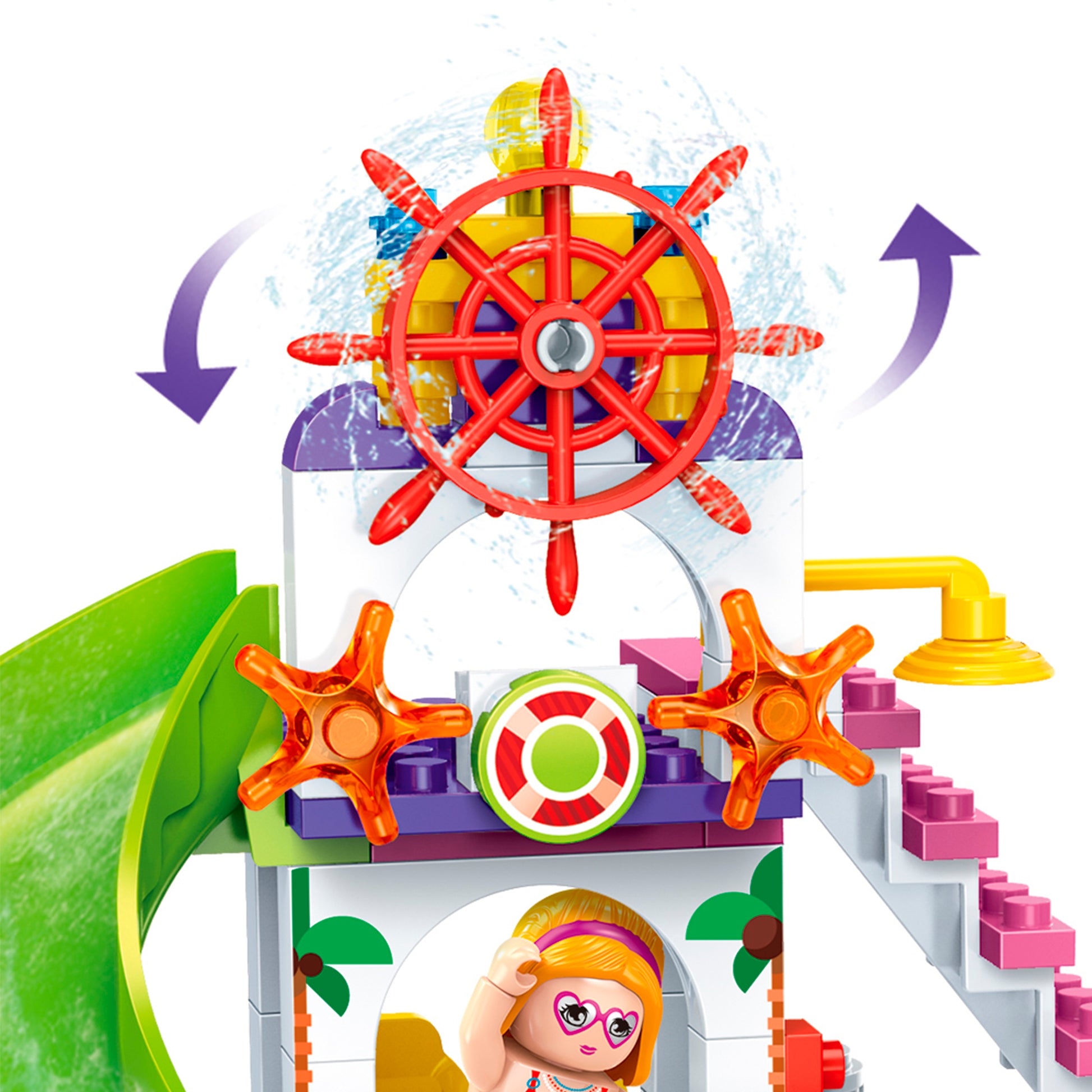 Durante un emocionante juego, el niño, combinando diferentes piezas, podrá construir un auténtico parque acuático de playa.