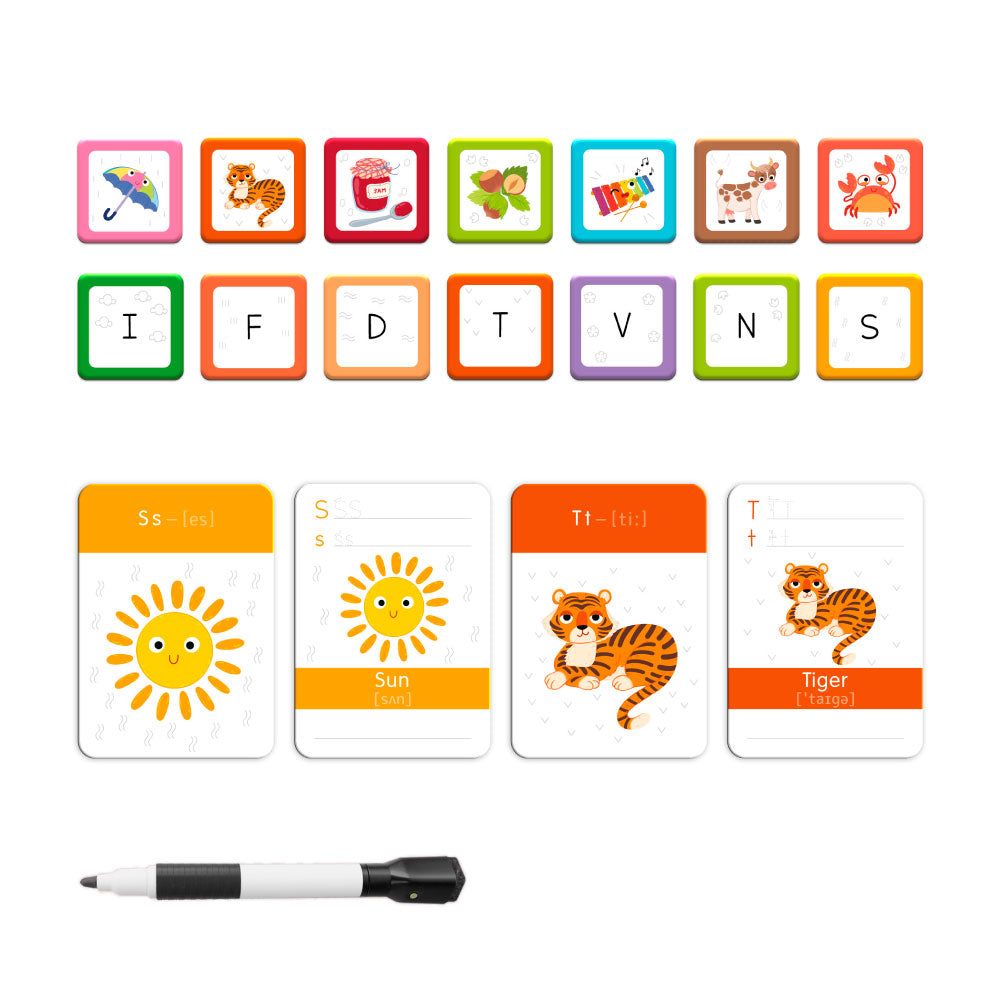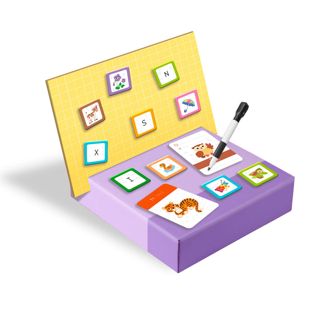 Juego completo: 1 tableta magnética, 139 elementos magnéticos, 26 tarjetas, marcador de paneles de yeso.