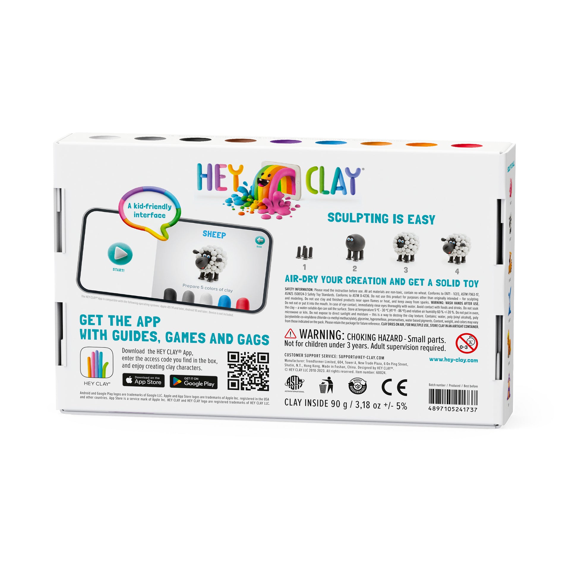 La arcilla no es tóxica, no tiene un olor específico, no contamina el medio ambiente y, por supuesto, es segura para los niños. Se crea en estricta conformidad con los estándares de calidad EAC, CE y ASTM.