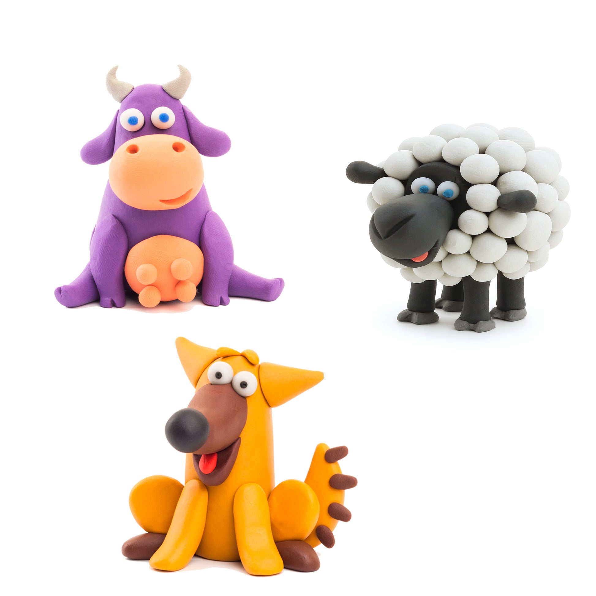 Invitamos a los animales más famosos, los convertimos en personajes y creamos el mundo animal HEY CLAY. Una vaca, un perro valiente, una oveja: son especialmente amados por los niños. Esculpe, juega y fantasea con ellos.