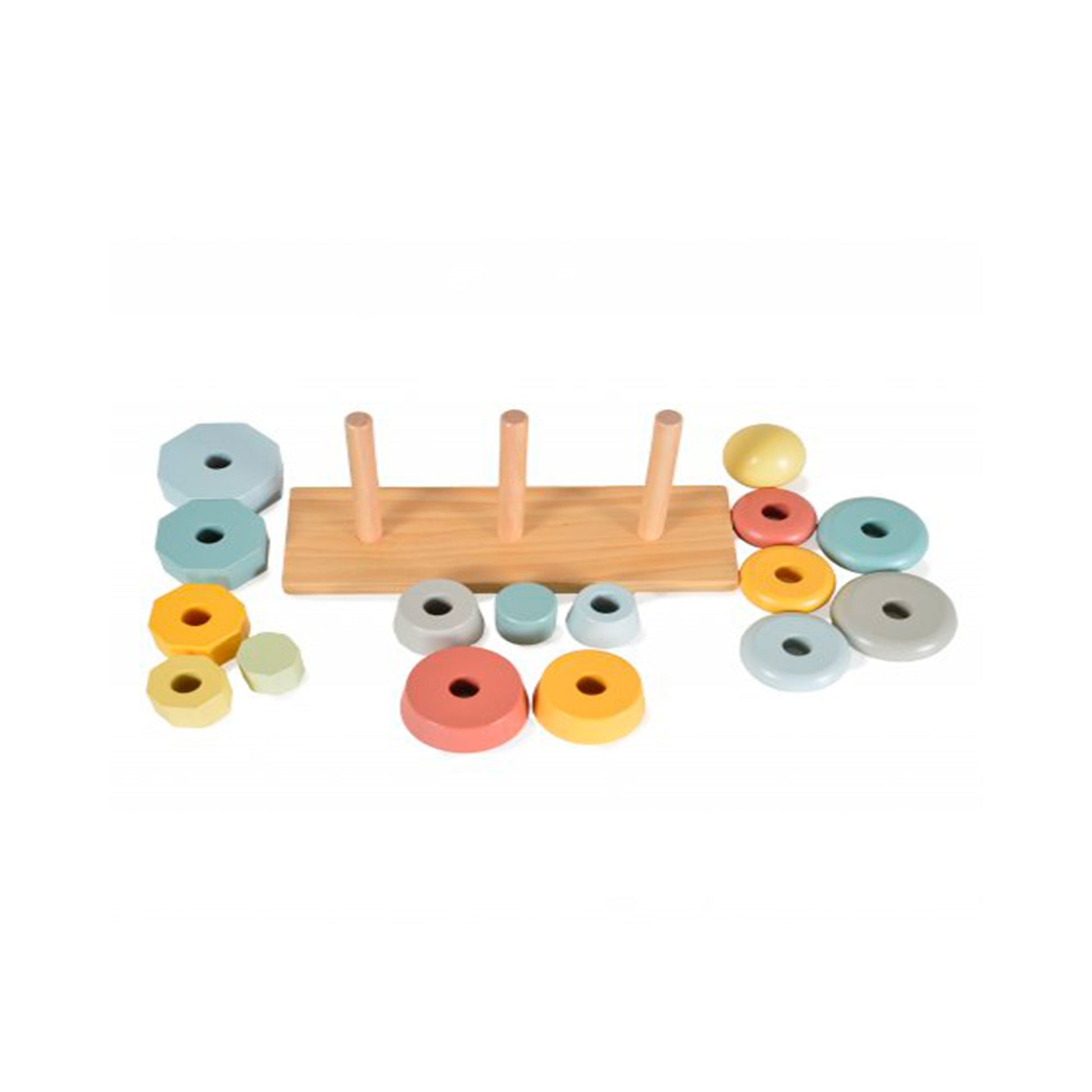 Juego de bloques de madera para apilar. Son 3 juegos de apilar en uno, consta de 3 torres de formas de colores.