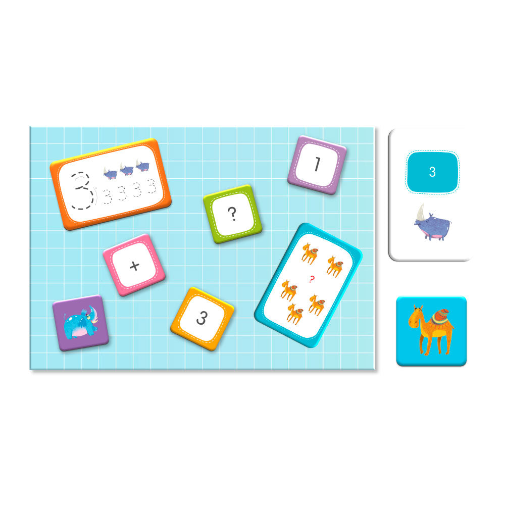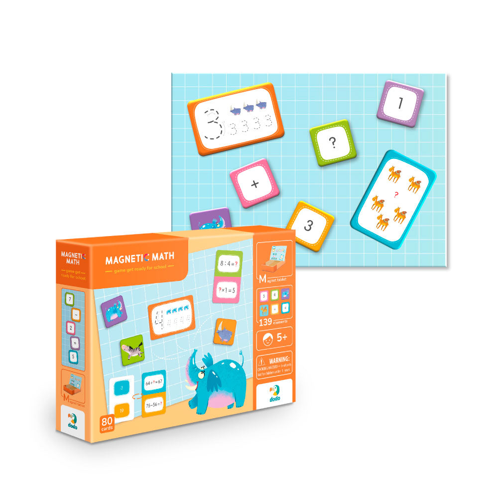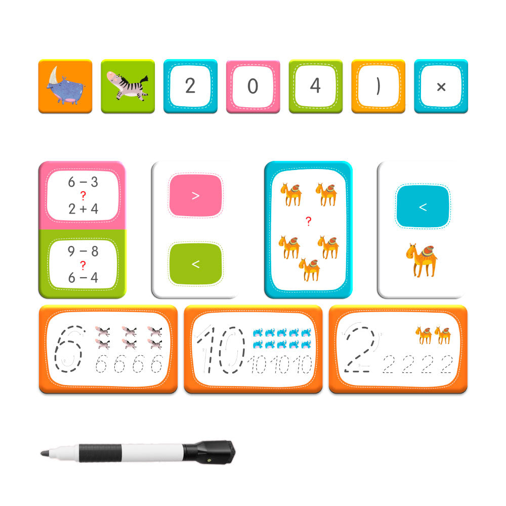 Estudiamos matemáticas con imanes brillantes. En el juego "Magnets Mathematics": una tableta magnética, un soporte debajo, tarjetas de aprendizaje, elementos magnéticos con números, animales y ejemplos. Este es un doble beneficio: el niño se divierte y aprende a contar rápidamente. Solo puedes jugar con cartas, aprender a escribir o agregar ejemplos de imanes.