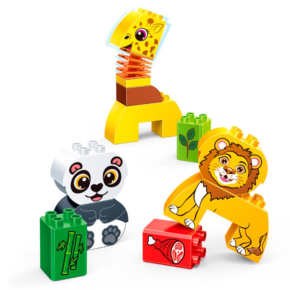 Contiene bloques para armar una jirafa, león y oso. Cada uno con sus respectivas piezas con lo que se alimenta cada uno de los animales.