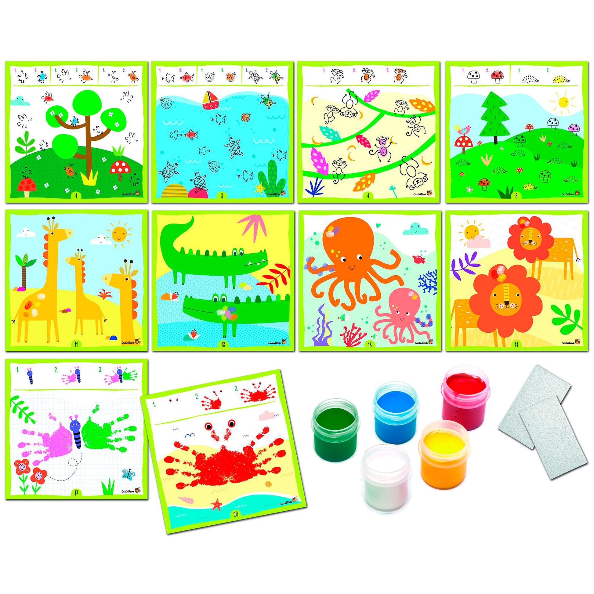 Un kit creativo para introducir a los más pequeños al mundo del arte y la creatividad. El juego incluye pinturas de dedos de alta calidad, lavables, dermatológicamente probadas y fabricadas en Italia, además de muchas imágenes para completar usando solo las huellas dactilares.
