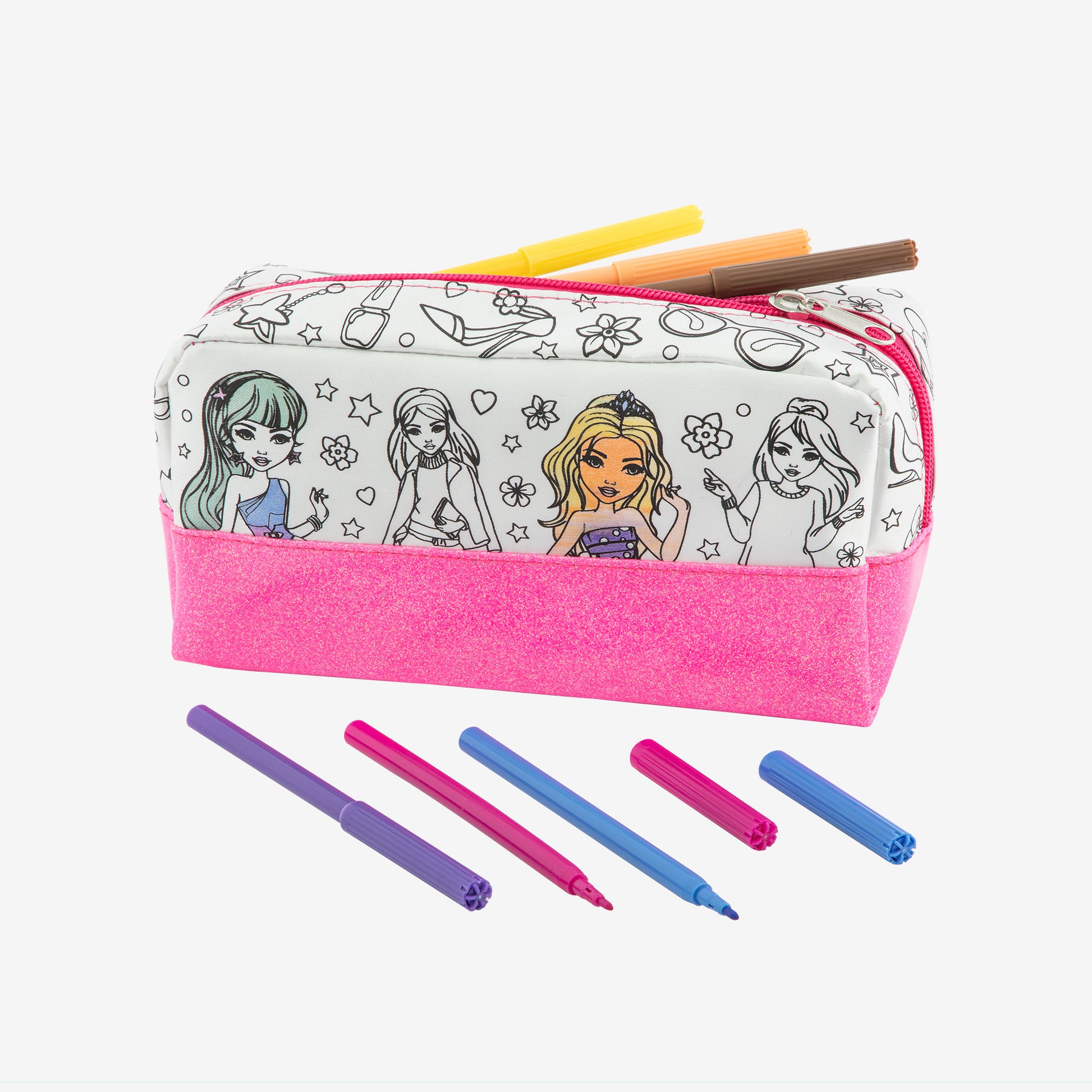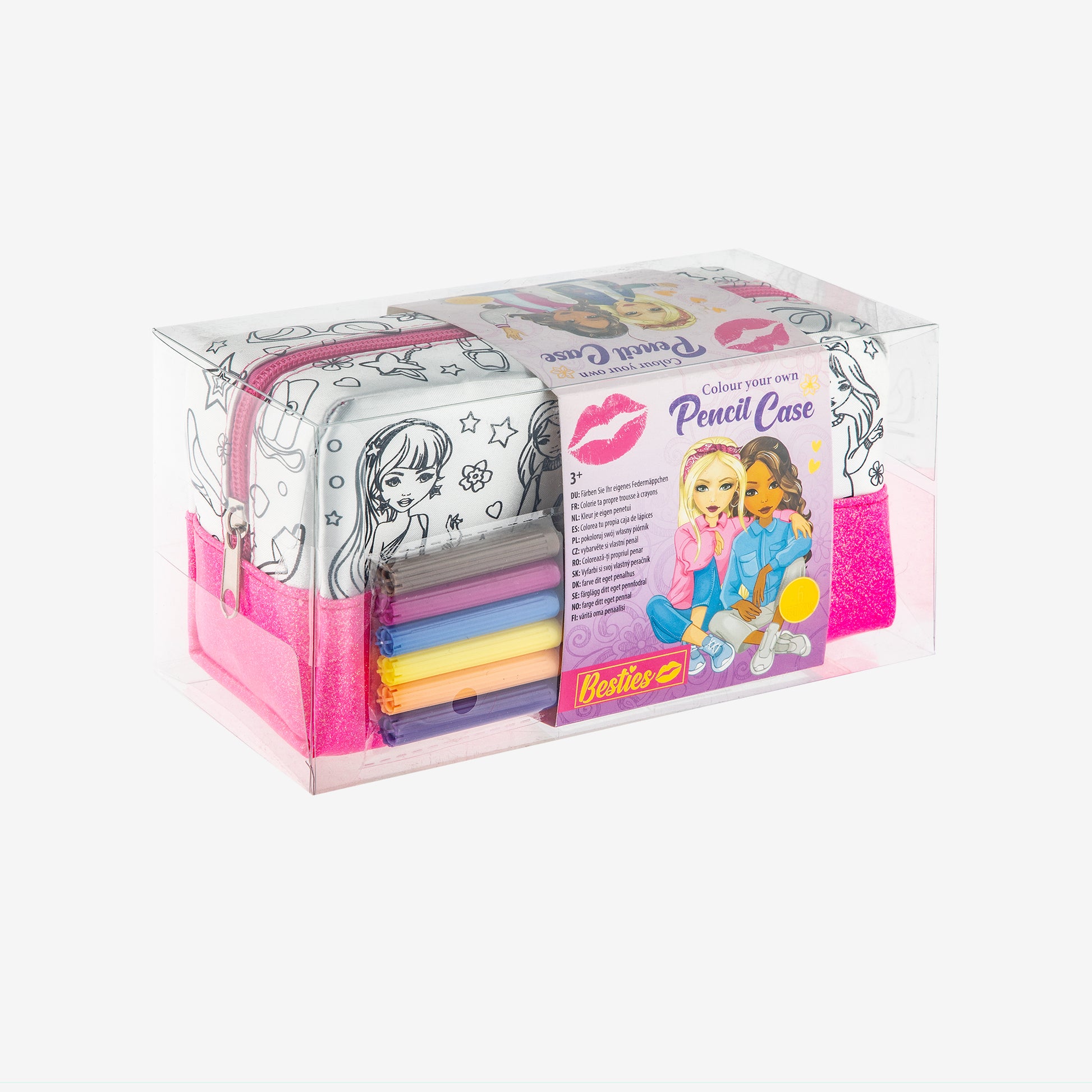 El estuche luce un precioso estampado de Besties a la moda, listo para que tu pequeña lo coloree y luego lo utilice.