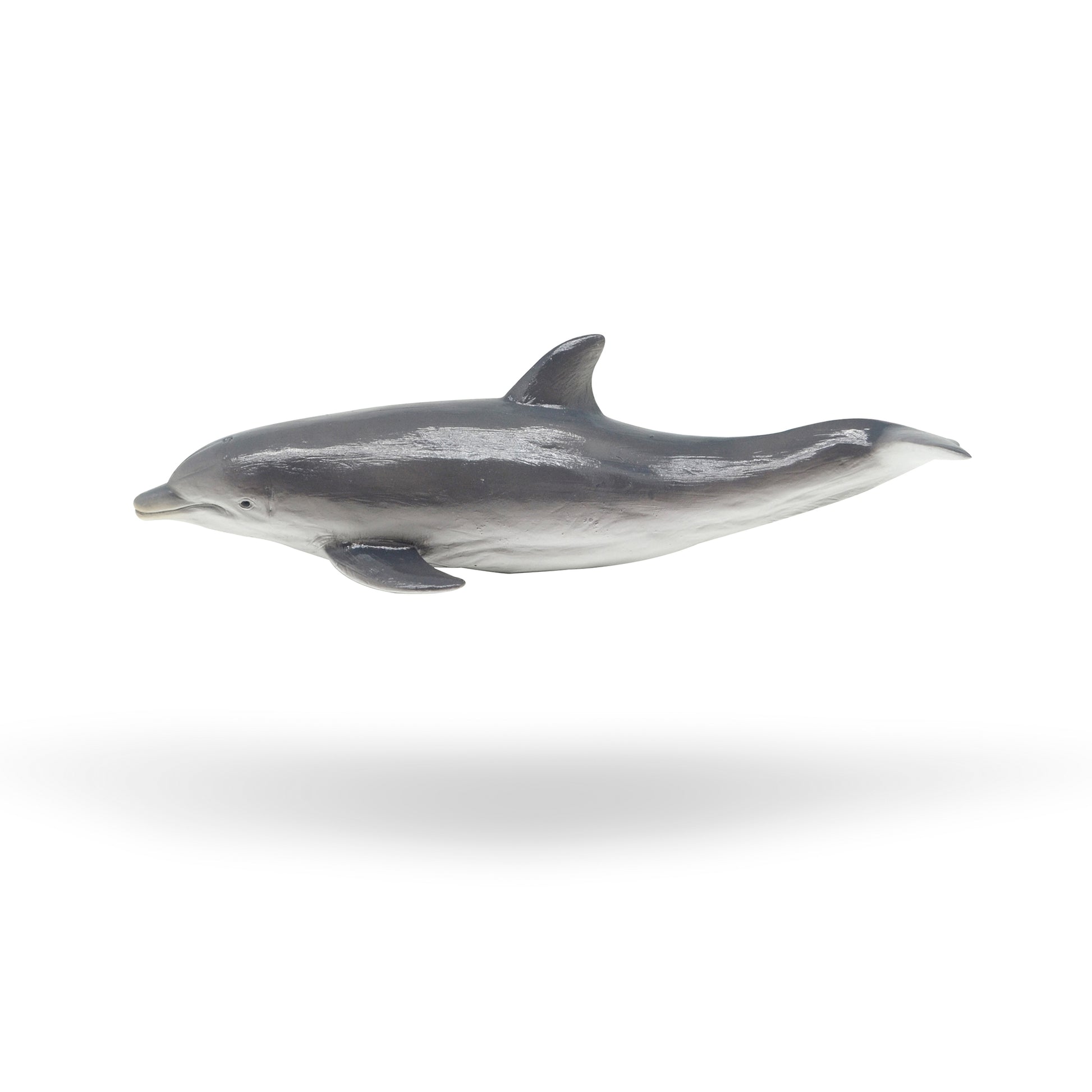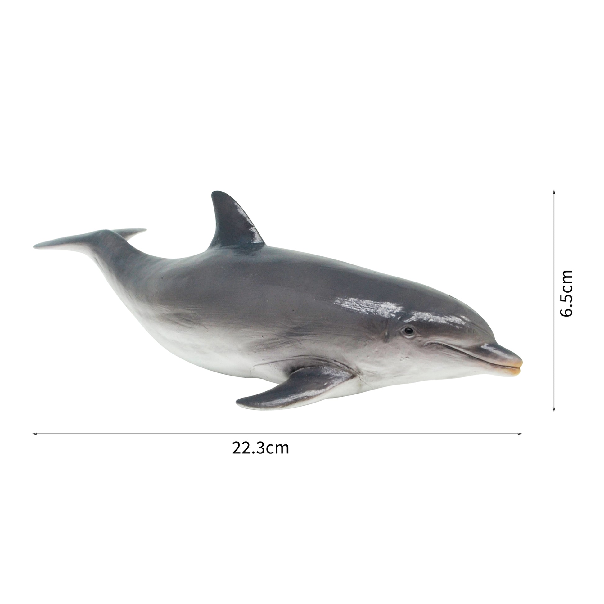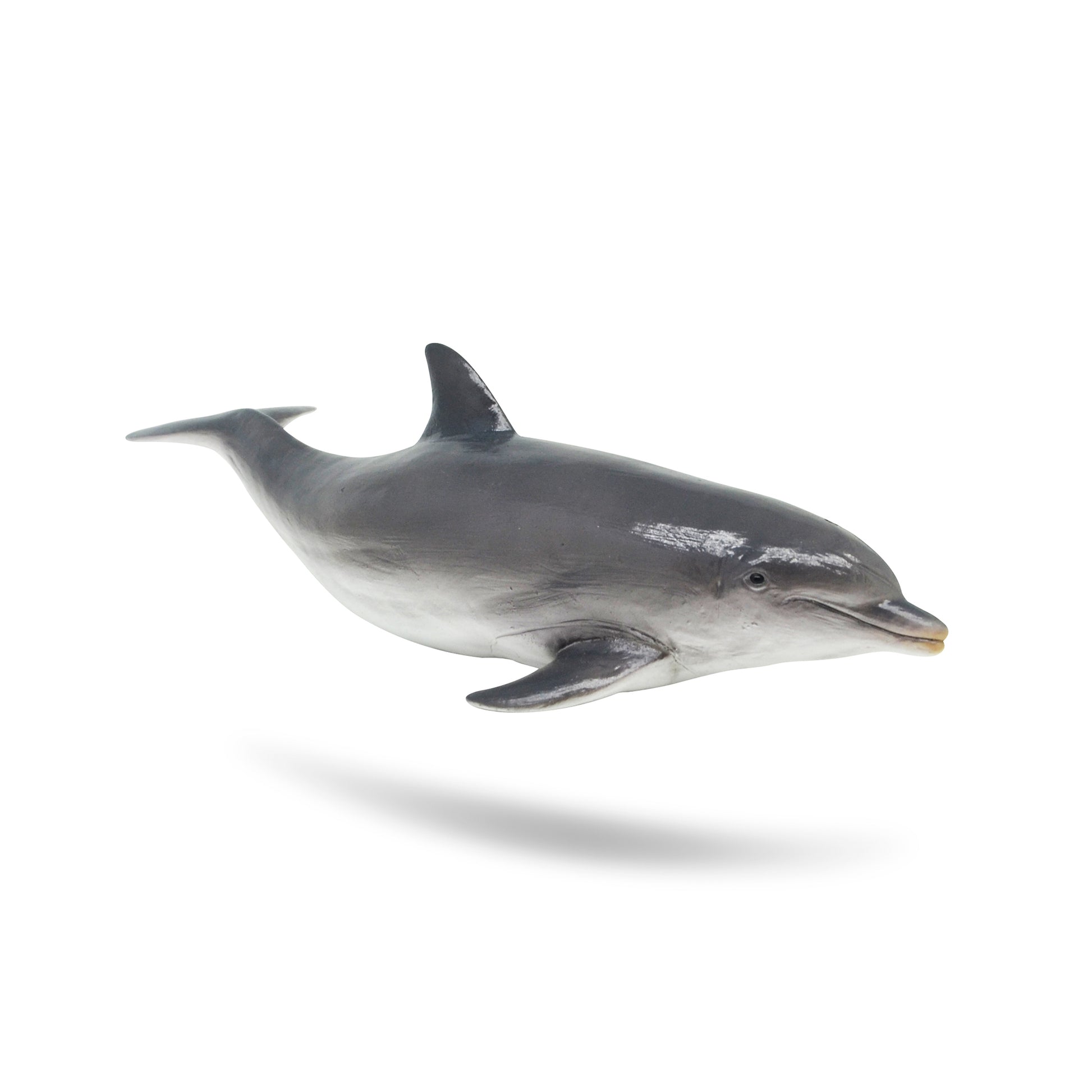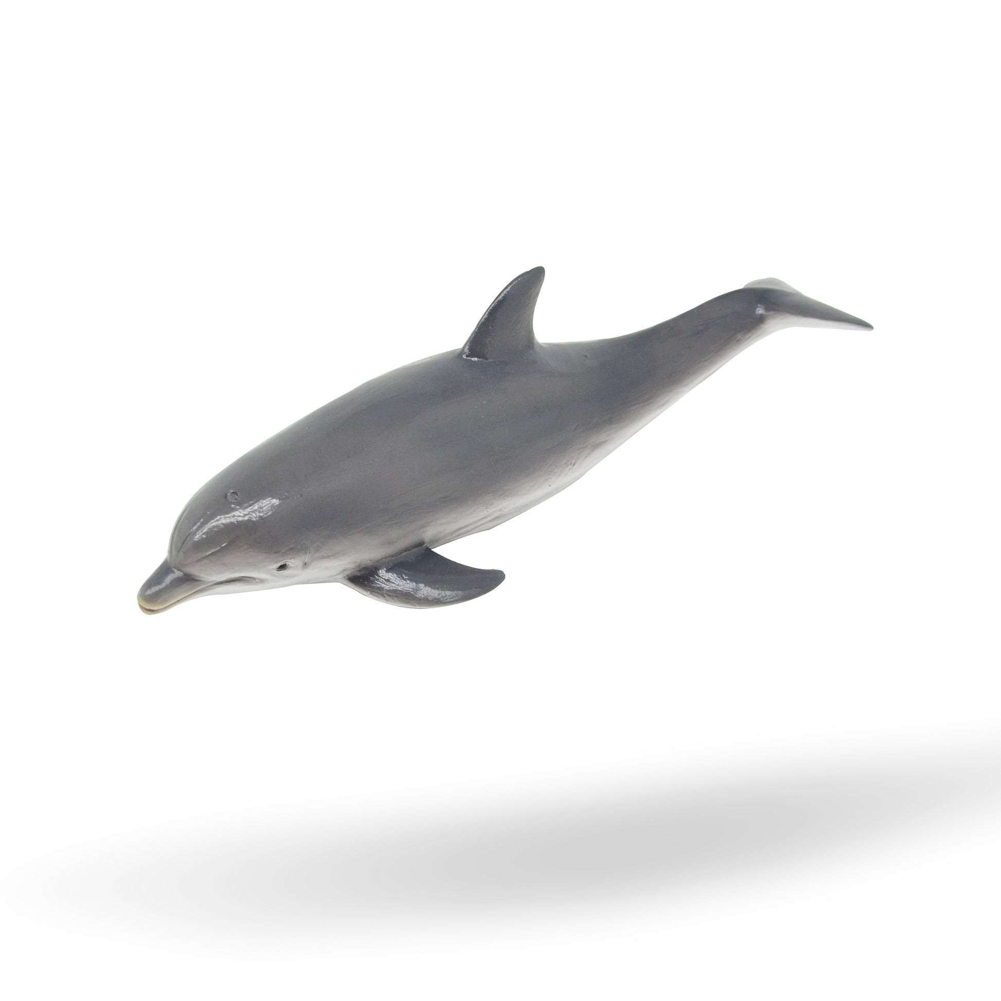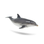 El delfín tiene un hocico corto y bien definido que parece una botella de ginebra antigua, con aletas y cola. Un espiráculo en la parte superior de la cabeza.