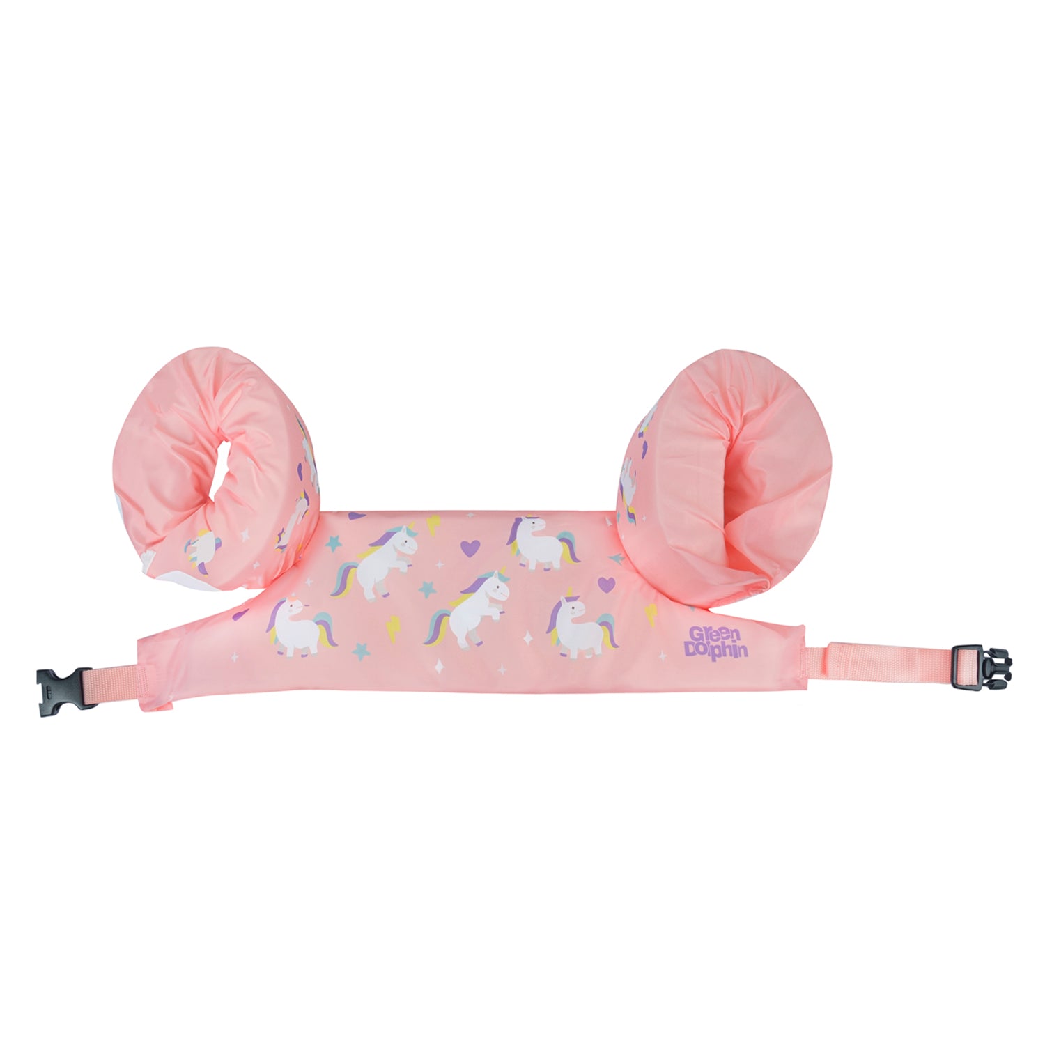 Contiene un flotador frontal y dos alitas en los brazos, además de una correa ajustable en la espalda para acomodarlo a la contextura del infante.