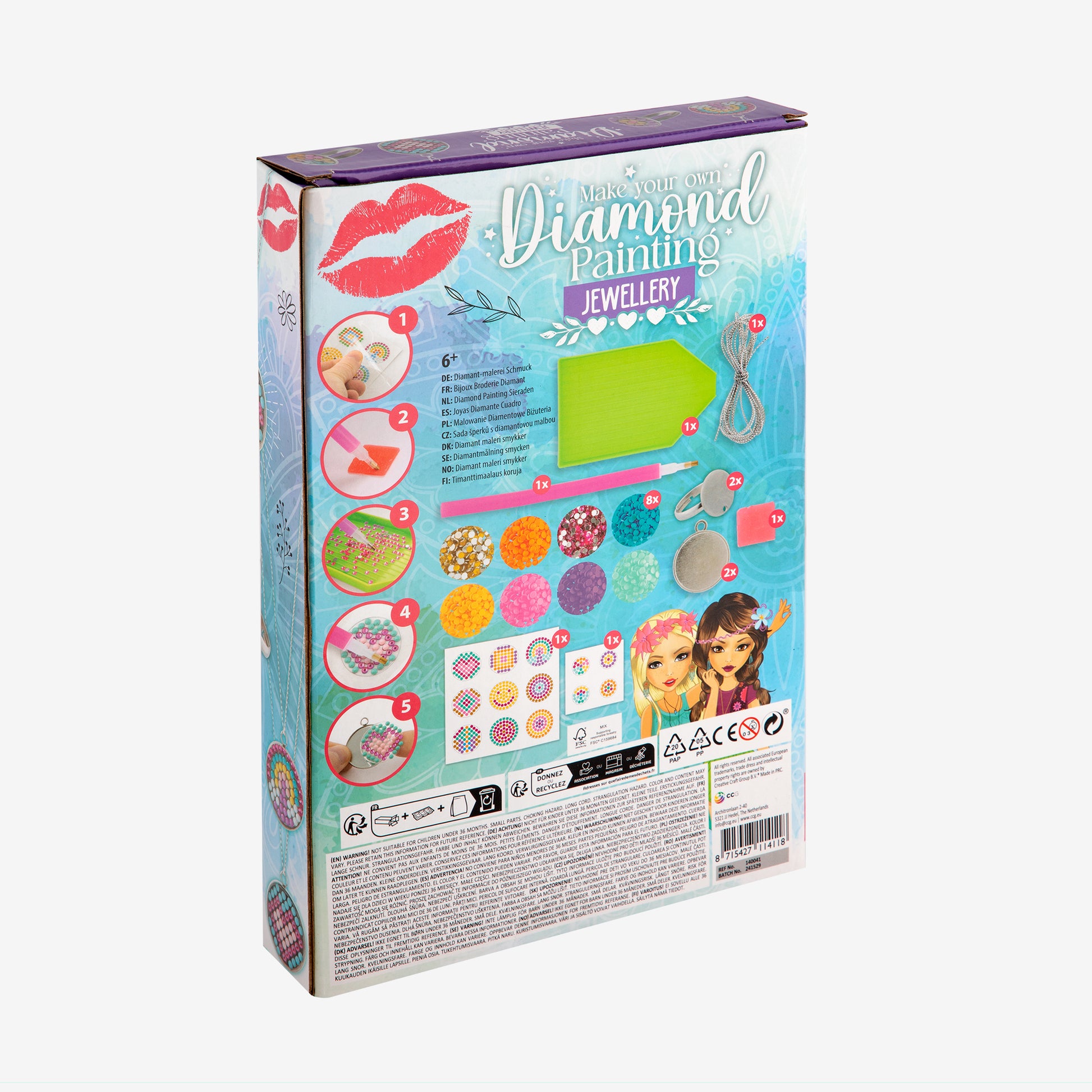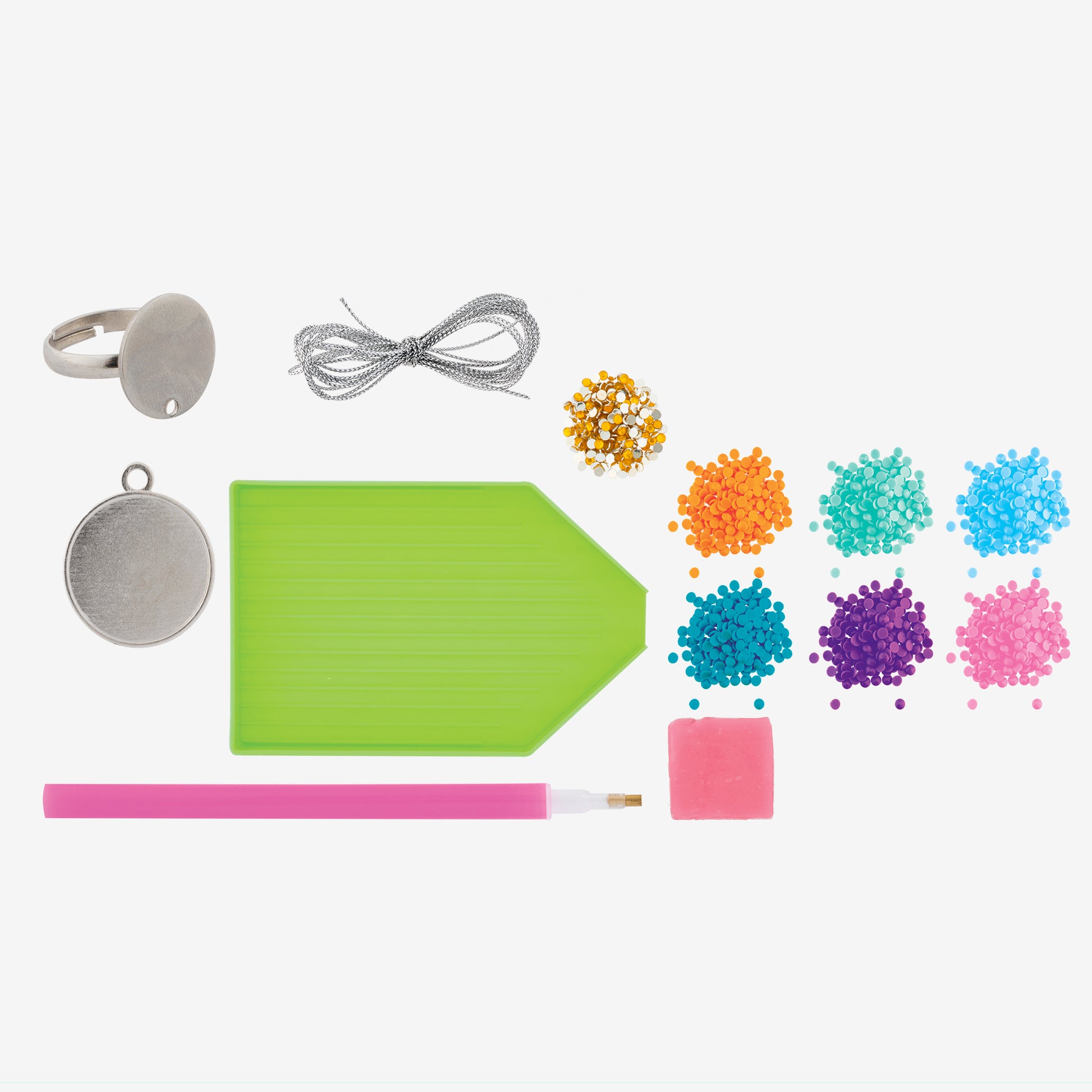 Incluye 8 colores de diamantes con su bandeja, lápiz y pegamento.