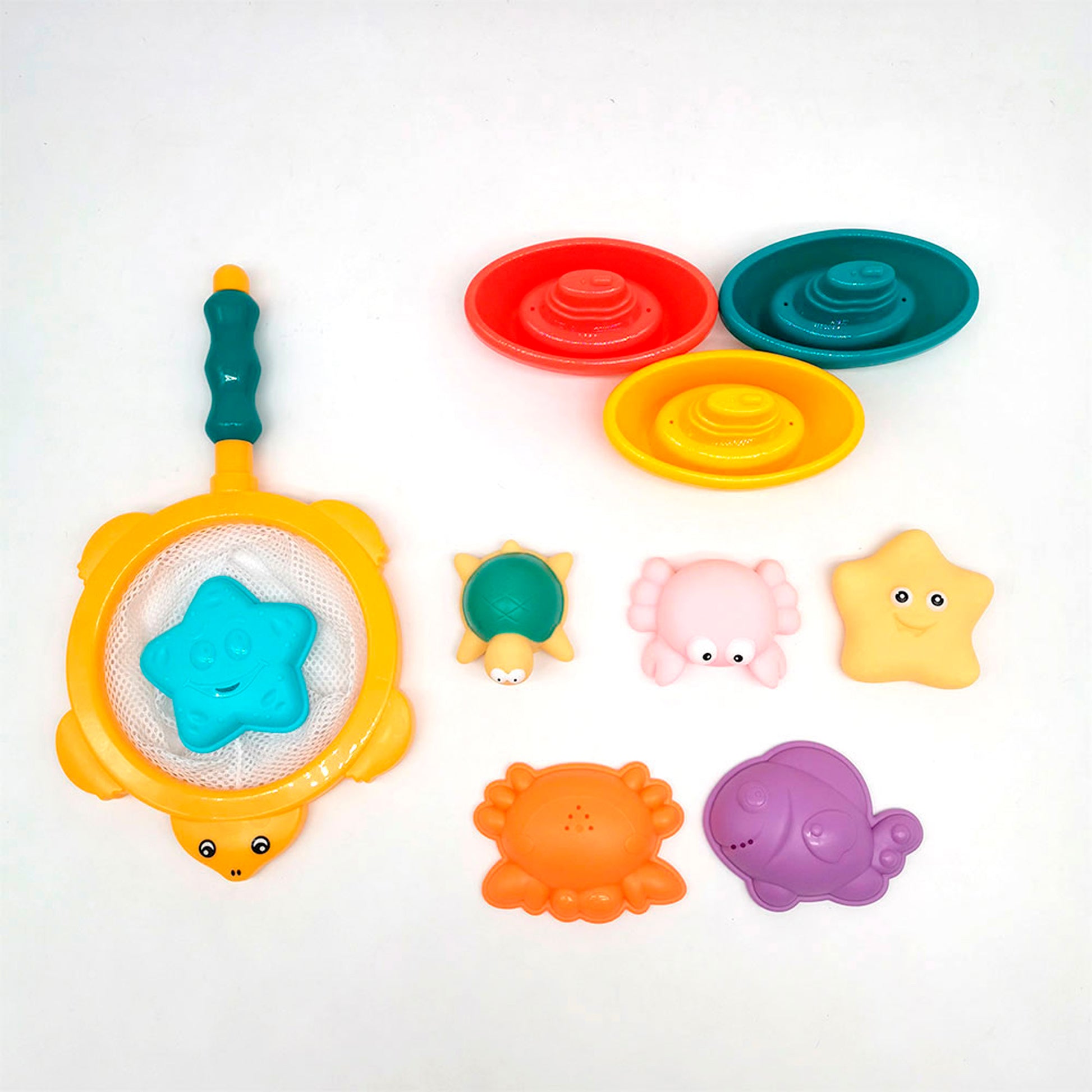 El set de baño incluye una red y 9 elementos diferentes: 3 barcos, 2 estrellas, una tortuga, un cangrejo, un cangrejo de río y un pez. Los elementos flotan en el agua y se pueden atrapar con una red con forma de tortuga.