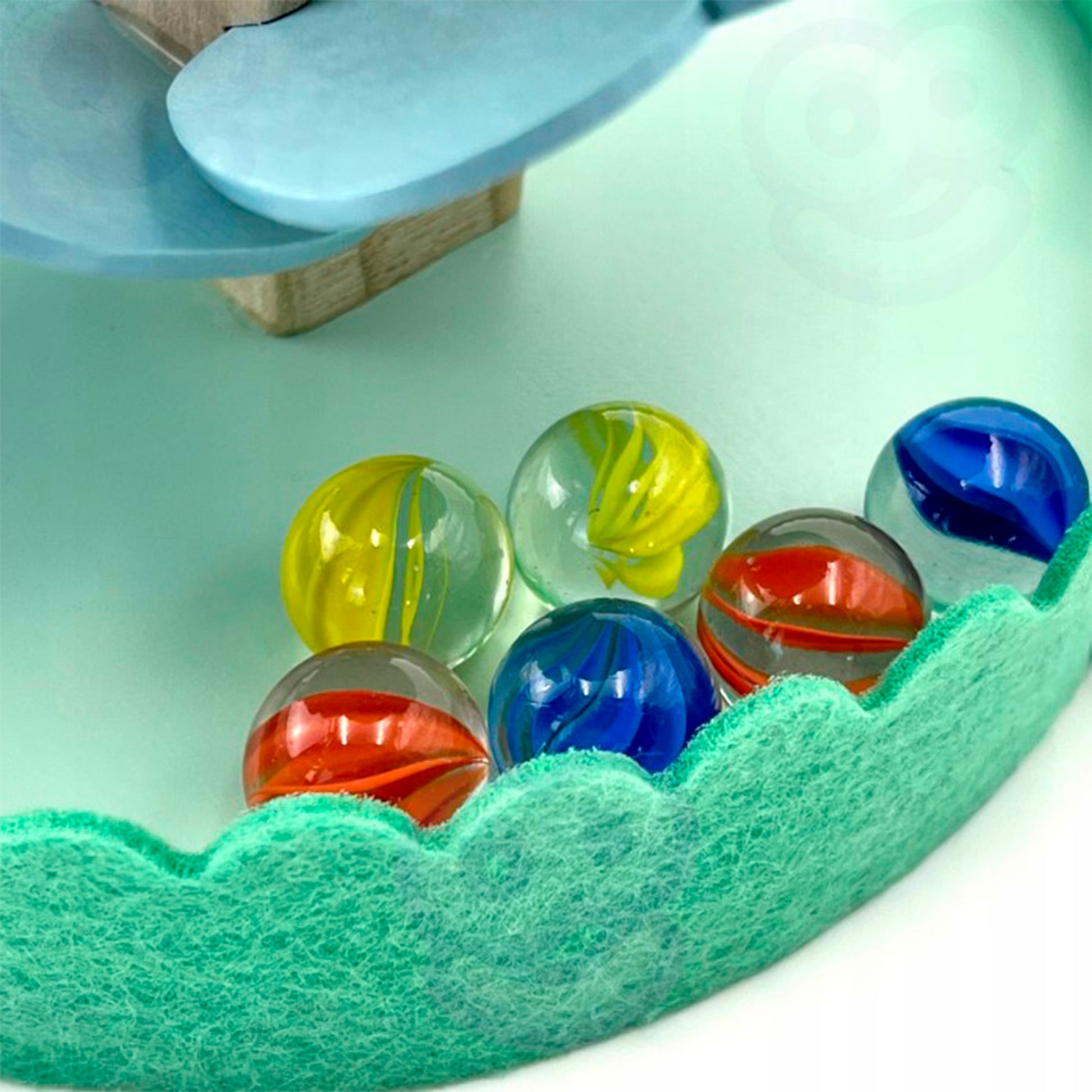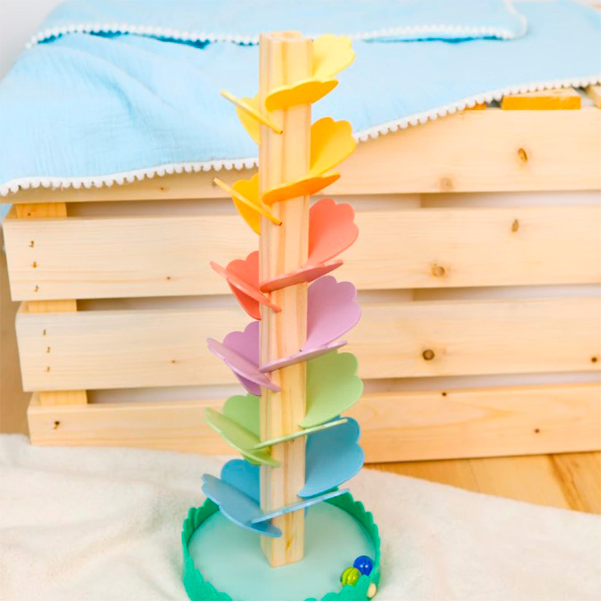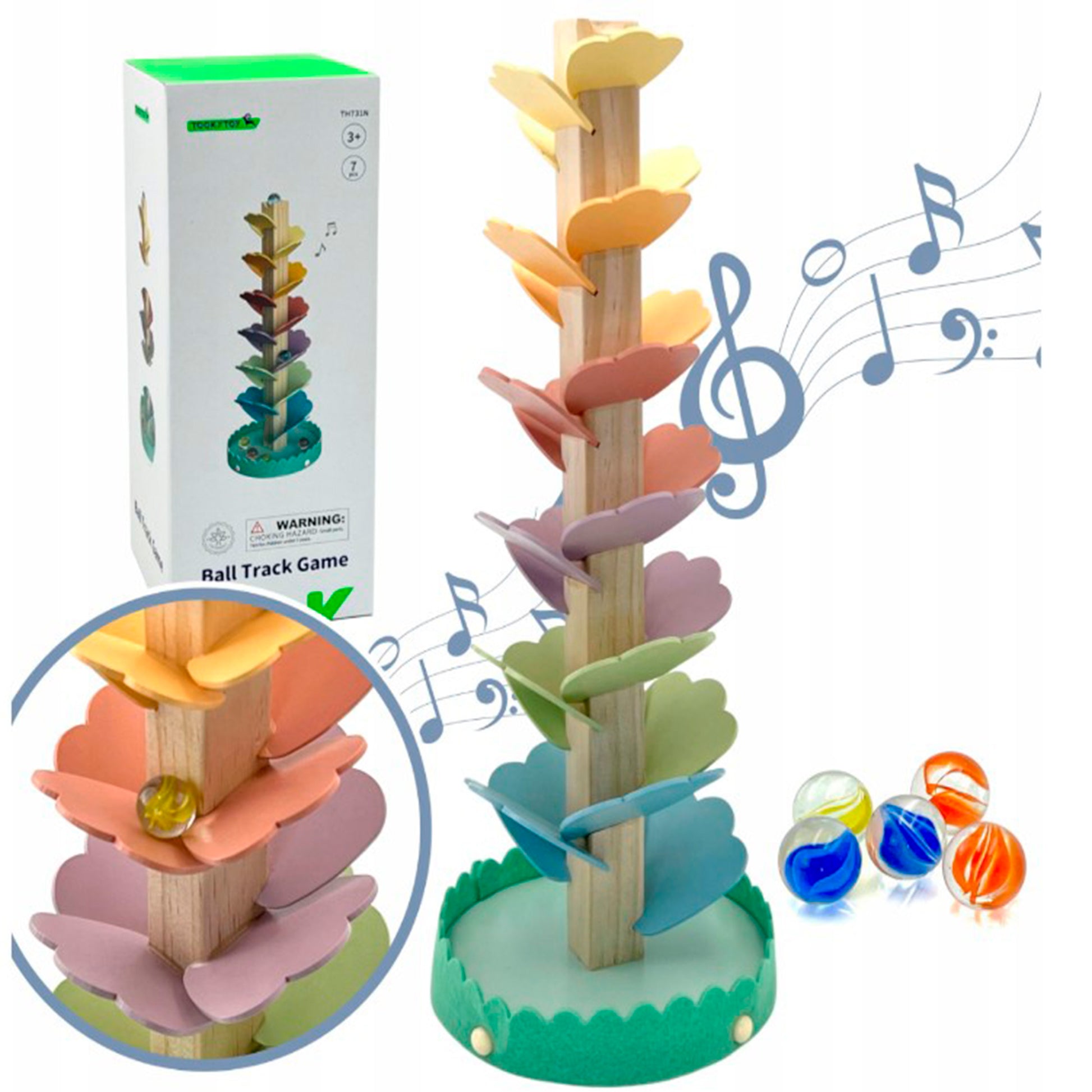 La pista de bolas proporciona mucha diversión, pero también es una excelente herramienta educativa. Los niños aprenden las leyes básicas de la física, la lógica y practican la coordinación ojo-mano. Además, todo el juego va acompañado de sonidos agradables: cuando la pelota cae por los peldaños de madera.