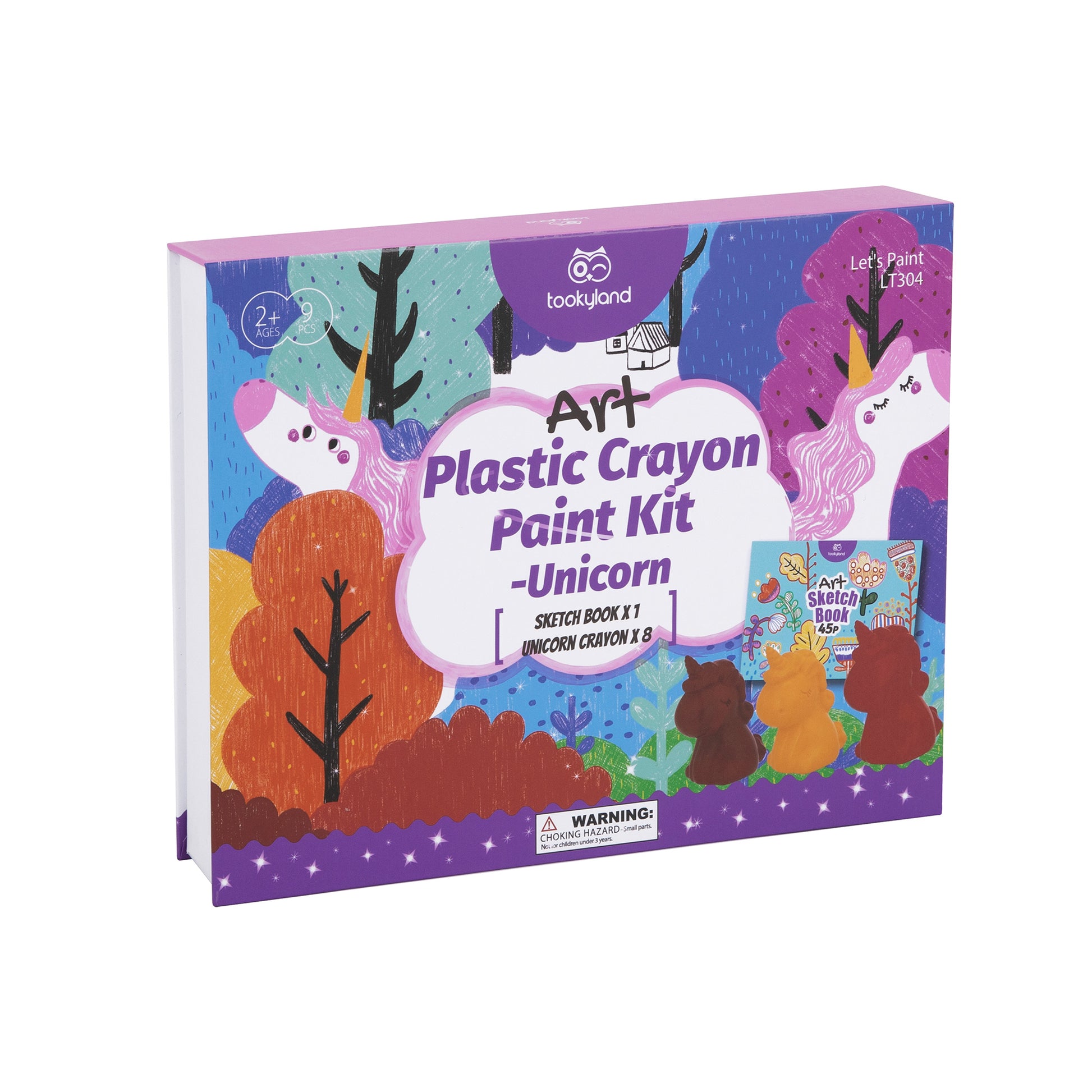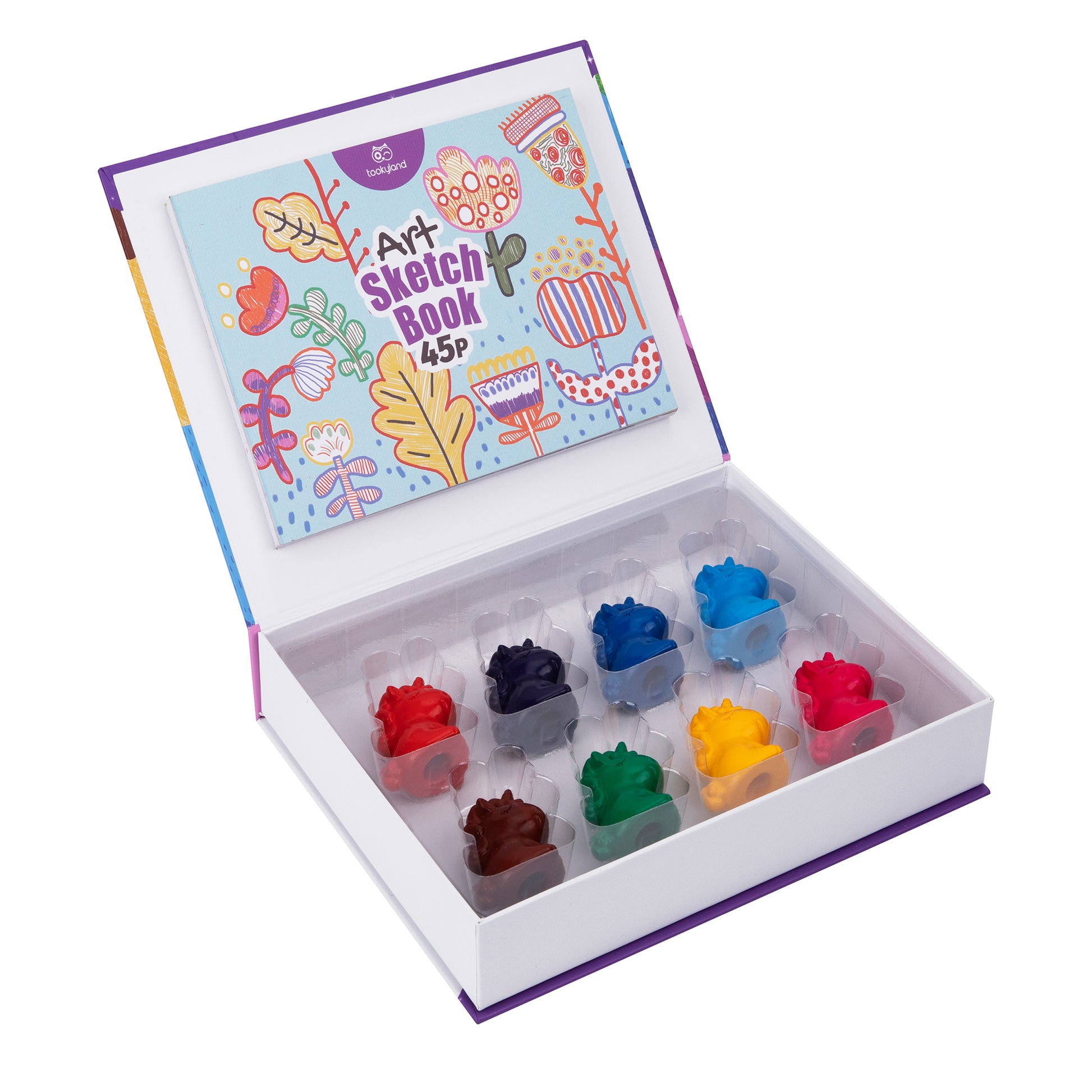 En una caja resistente con cerradura, los niños encontrarán 12 crayones de hermosos colores en forma de lindos unicornios y 1 cuaderno creativo con 45 hojas llenas de libros para colorear y hojas de dibujo en blanco.