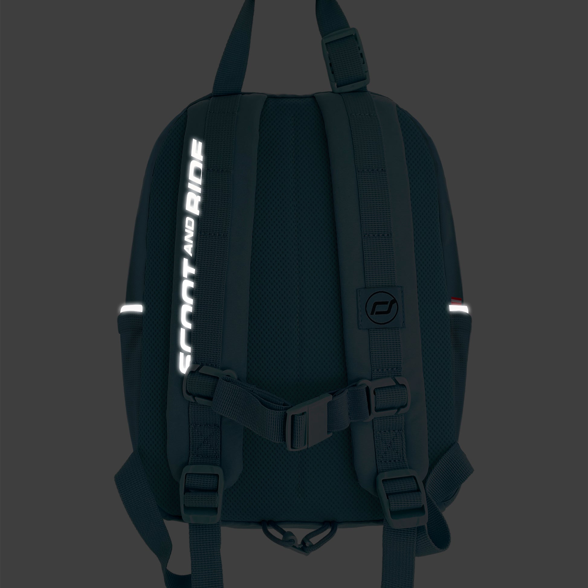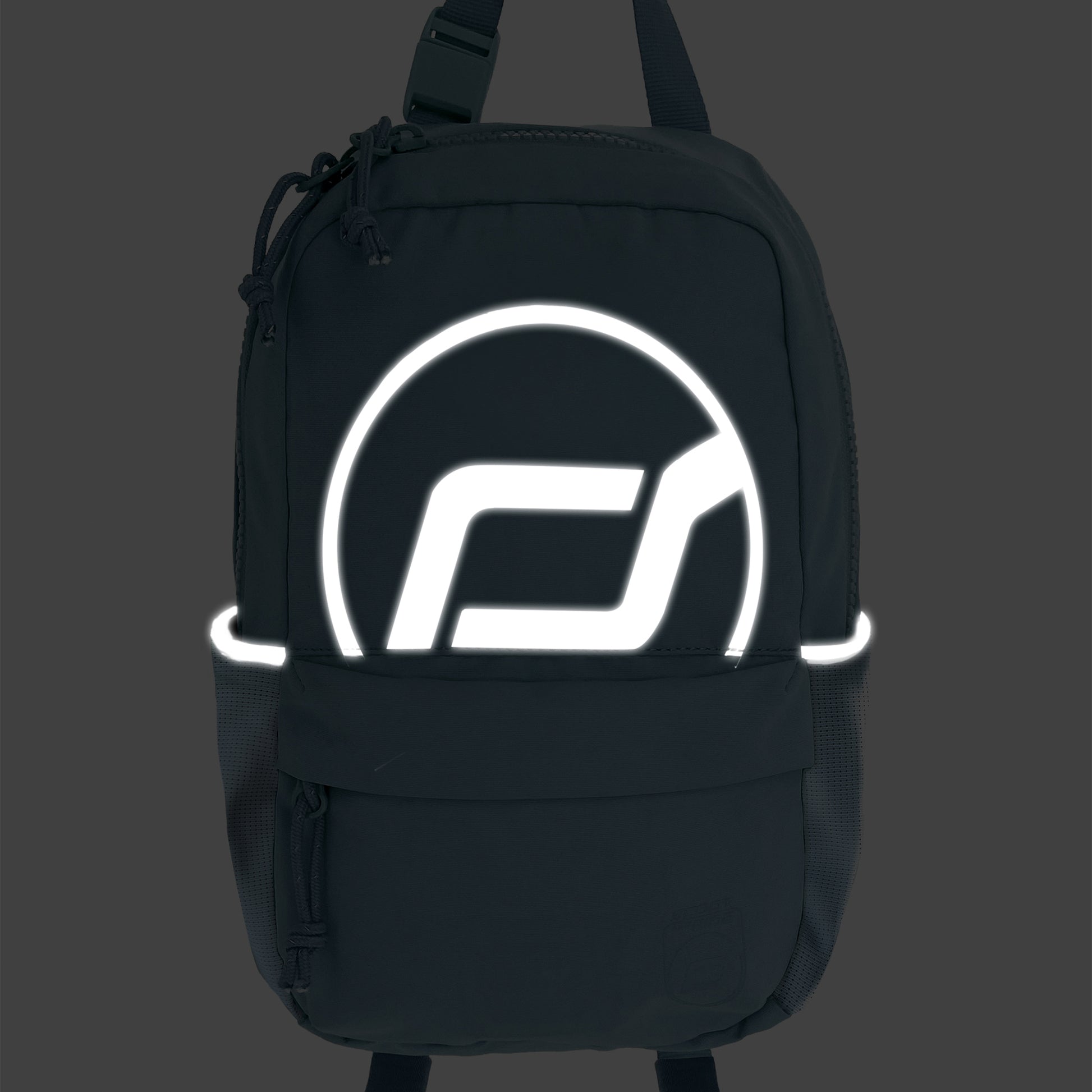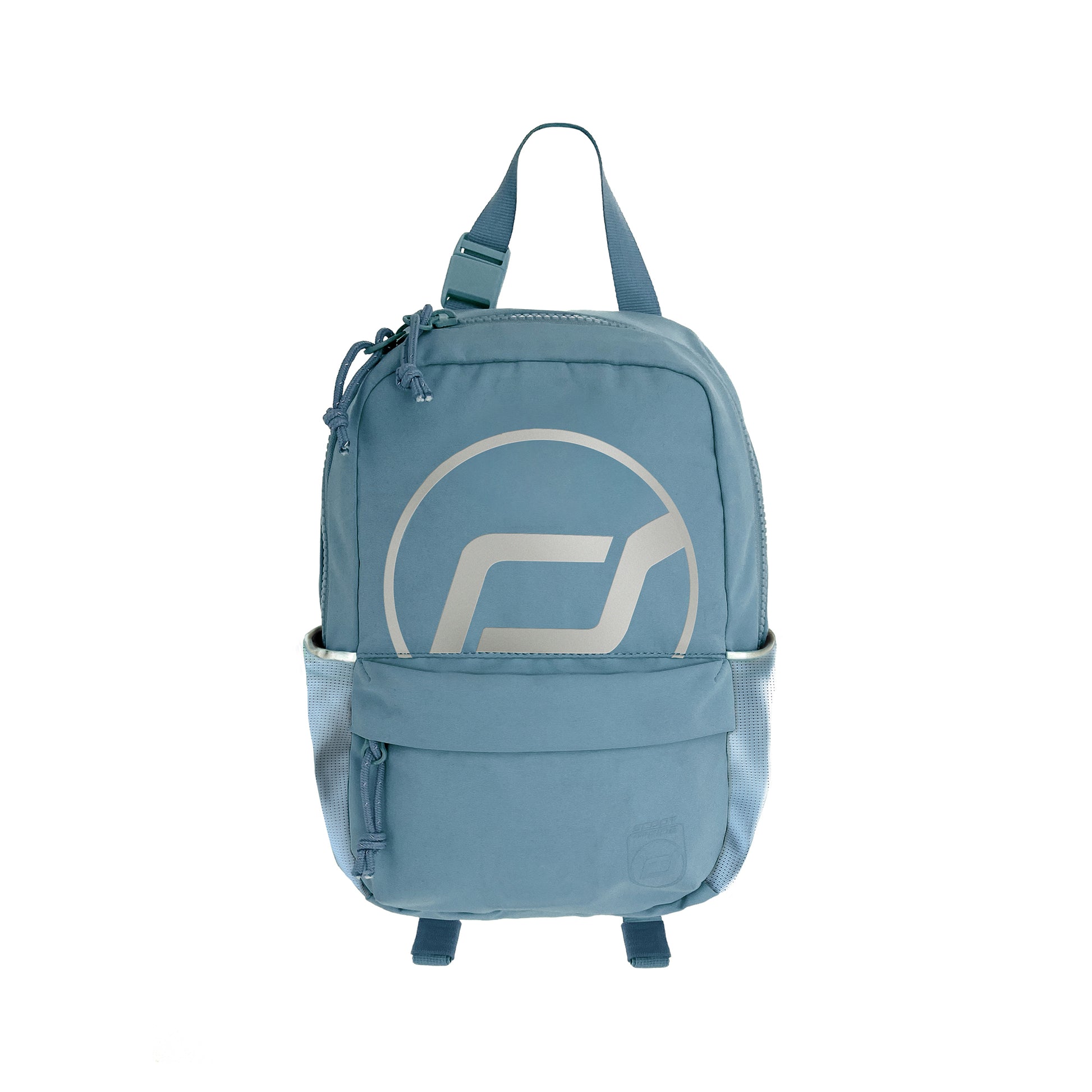 Está fabricada con material PET reciclado. Es repelente al agua y con una capacidad de 9 litros. La espalda y correas en los hombros tienen un acolchado suave para un transporte cómodo. En la parte lateral posee 2 porta botellas y 2 bolsillos con cierre (exterior e interior), además incluye un llavero.