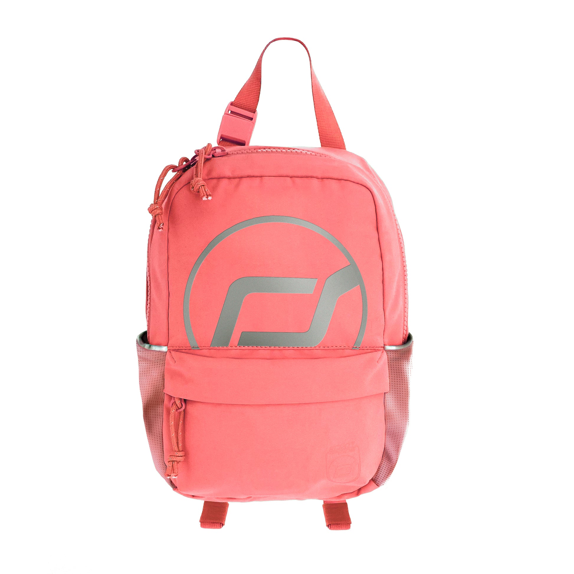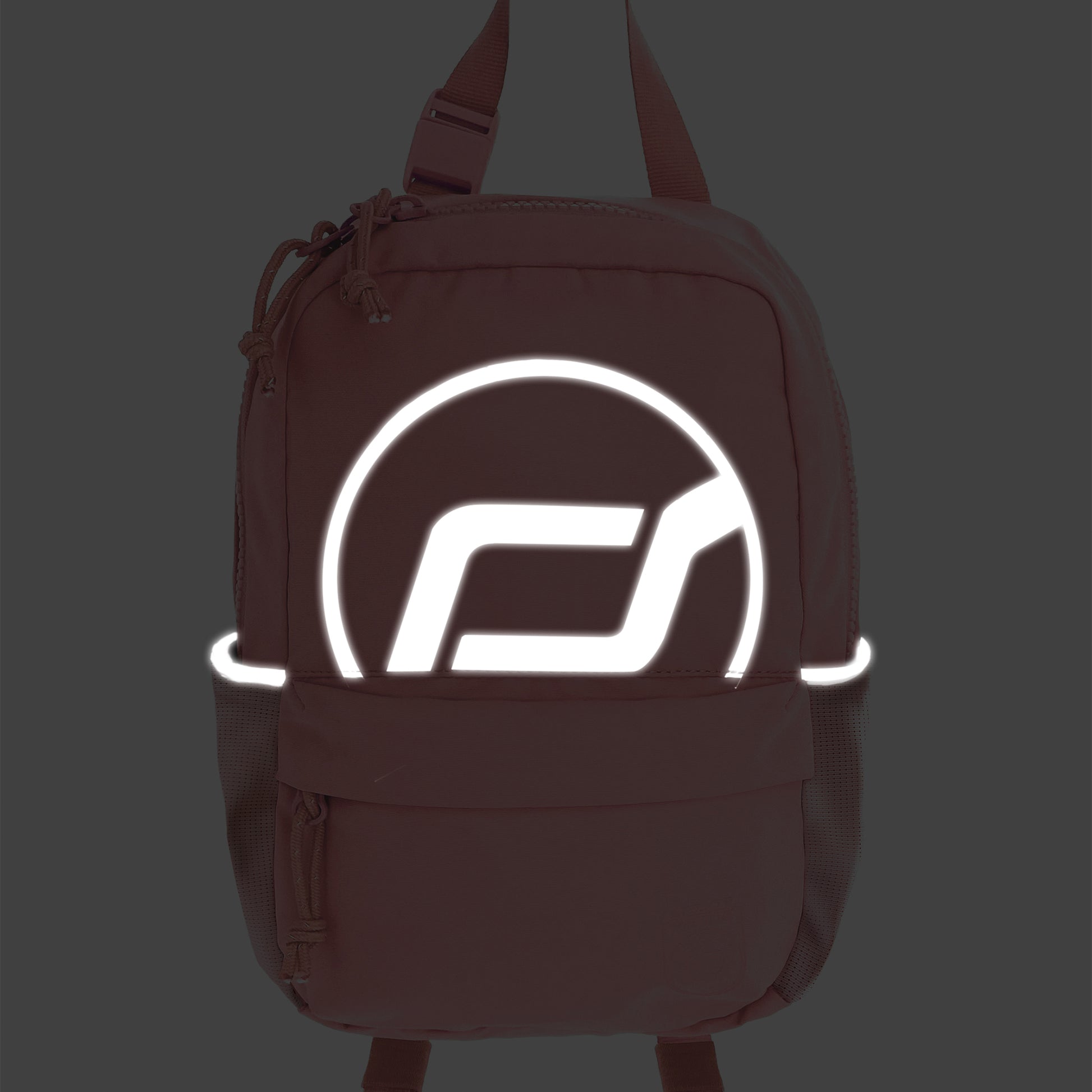 Está fabricada con material PET reciclado. Es repelente al agua y con una capacidad de 9 litros. La espalda y correas en los hombros tienen un acolchado suave para un transporte cómodo. En la parte lateral posee 2 porta botellas y 2 bolsillos con cierre (exterior e interior), además incluye un llavero.