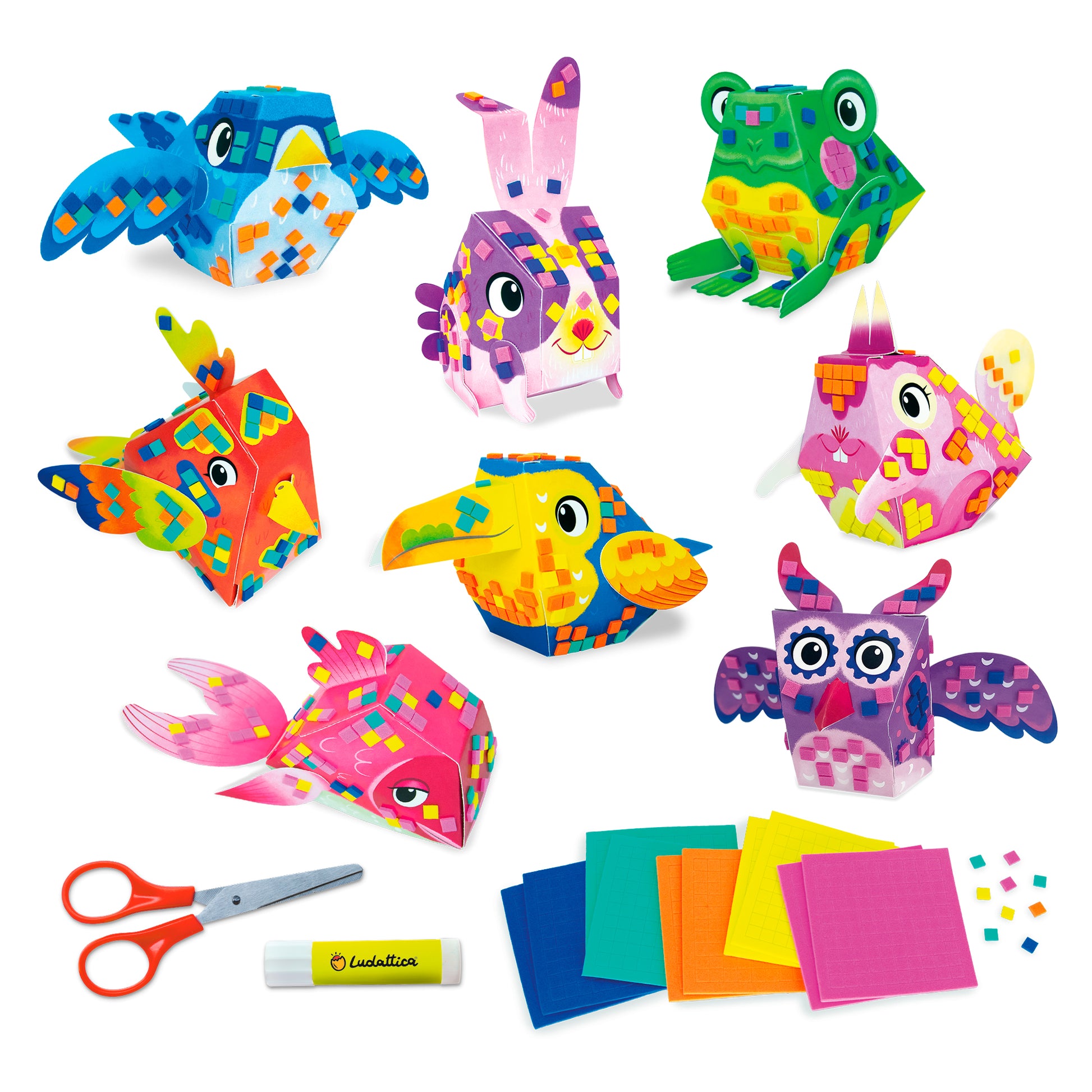 La caja contiene todo lo necesario: láminas de cartón para recortar y ensamblar con el pegamento y las tijeras incluidos, y un juego de 1000 piezas de mosaico de goma autoadhesivas para completar las esculturas. Este juego está diseñado específicamente para estimular la concentración y la creatividad en niños a partir de 5 años.
