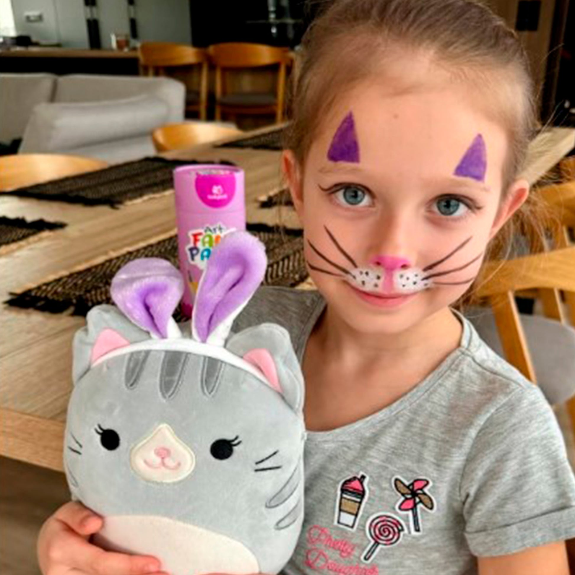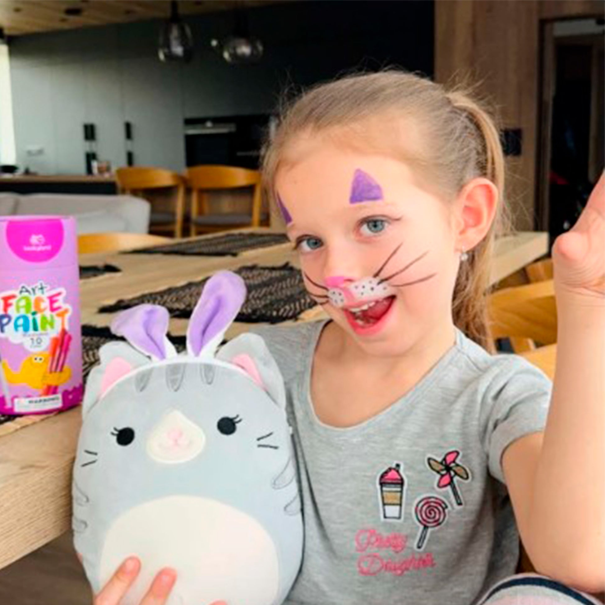 El set contiene 10 crayones de colores intensos que te permiten crear diferentes patrones y combinaciones. En el paquete también encontrarás 2 pinceles con los que la creación en el rostro del niño quedará aún más detallada y perfecta. Gracias al embalaje de plástico, no te ensuciarás las manos con las pinturas y podrás transportarlas de forma segura en la caja de papel.