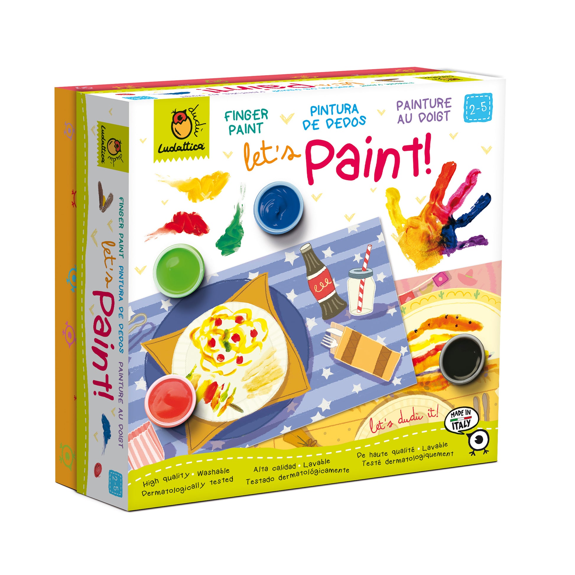 Se puede jugar a cocinar, usando los colores y mucha imaginación: la hoja de papel hará de plato, los ingredientes serán los colores, y los cucharones... las manos de los niños. El juego incluye un set para pintar con los dedos de alta calidad, con tinta lavable y dermatológicamente testada, apto para niños a partir de 2 años.