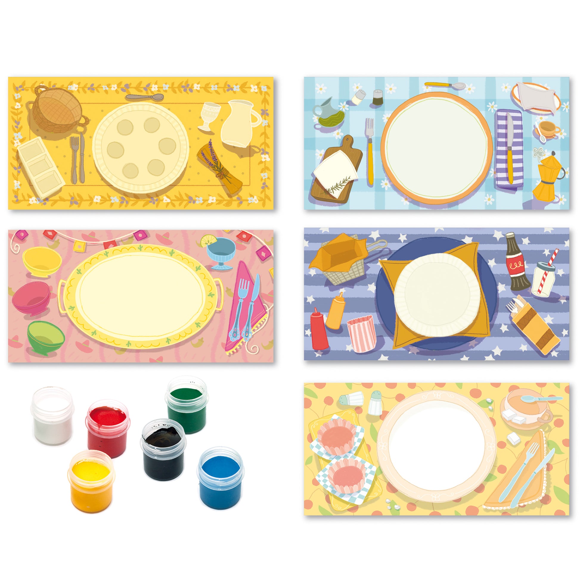 Contiene 12 manteles individuales ilustrados 42×21 cm, 6 colores de dedos, guía ilustrada.
