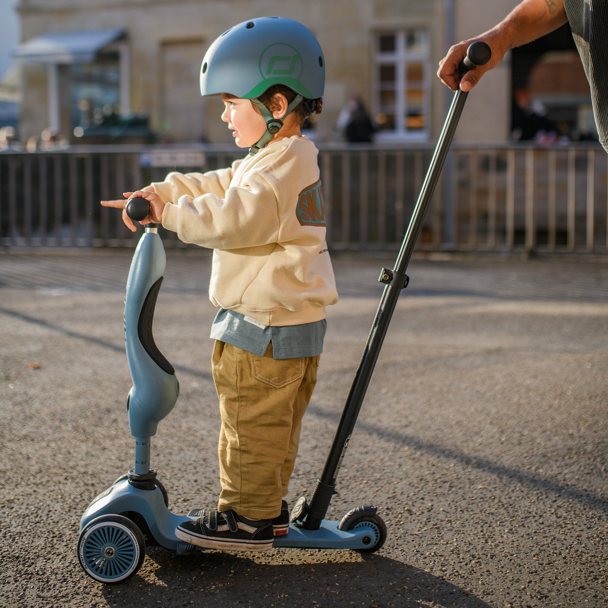 Ahora es posible empujar a niños de entre uno y tres años cómodamente, tanto sentado como de pie de manera cómoda y segura. La práctica barra de empuje se puede fijar al reposapiés del patinete sin necesidad de herramientas y se puede ajustar a tres alturas diferentes y se puede quitar sin necesidad de herramientas. También se pueden fijar reposapiés a la base para que los niños puedan descansar los pies cómodamente mientras se les empuja. Todas las funciones conocidas del Highwaykick 1, como el sistema 2 en 1 o el asiento regulable en altura, se mantienen en el Push and Go. Esto significa que este modelo también sigue creciendo con tu hijo.