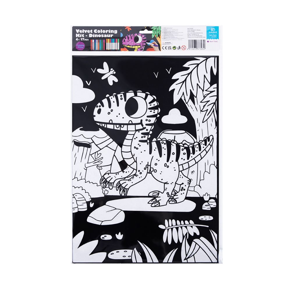 El set Pintura Terciopelo Dinosaurio se compone de una imagen con terciopelo, 8 rotuladores y 8 colas con purpurina de colores.
