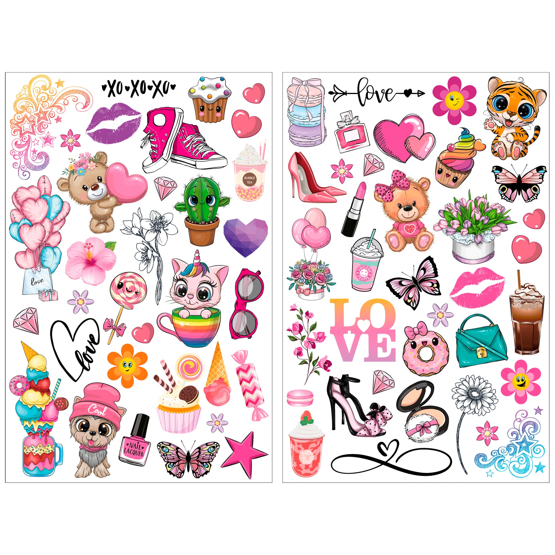 Los tatuajes de dan un toque genial, tanto para el día a día como para fiestas. En las 2 hojas de láminas hay un montón de diseños divertidos y coloridos para aplicar: corazones, flores, estrellas, accesorios de moda y mucho más.